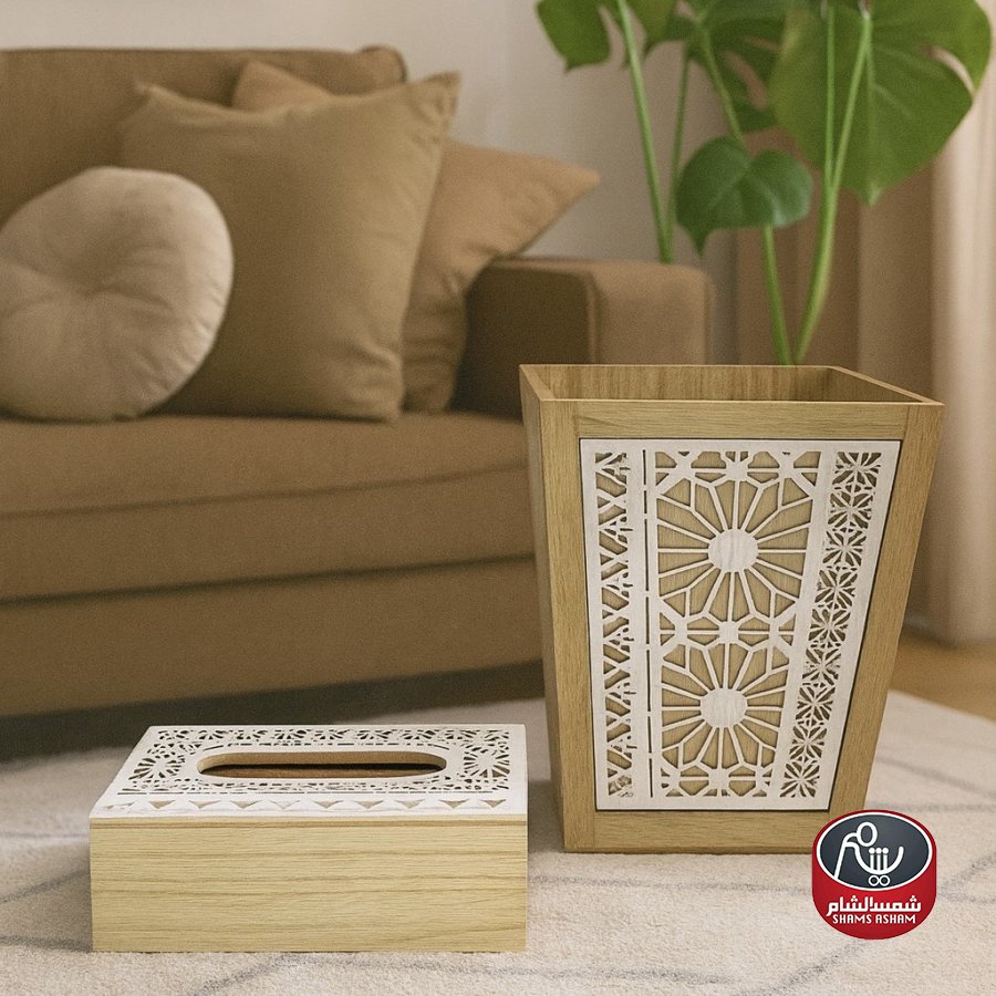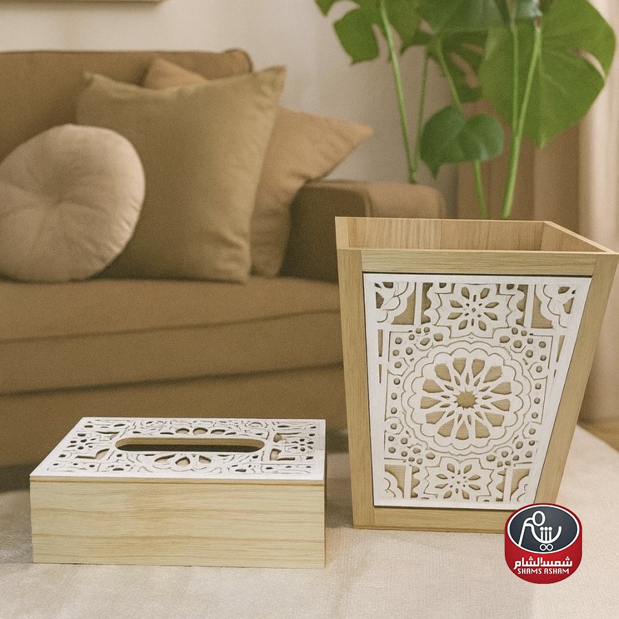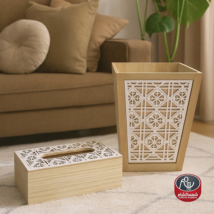 طقم خشبي أنيق بتصميم زخرفي مفرغ، مكوّن من سلة قمامة بحجم 22×29 سم وعلبة مناديل بحجم 22×13 سم، يجمع بين الجمال العملي والزخرفة الفاخرة ليضيف لمسة ديكورية مميزة للمنزل أو المكتب.
