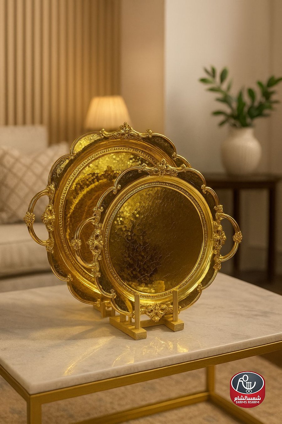 طقم صواني دائري فاخر باللون الذهبي الأنيق، متوفر بمقاسين 33×33 سم و 39×39 سم. يتميز بتصميم عصري بلمسة كلاسيكية تضيف فخامة لأي مناسبة، مثالي لتقديم الضيافة أو استخدامه كقطعة ديكور راقية تضفي لمسة من الرفاهية على منزلك.