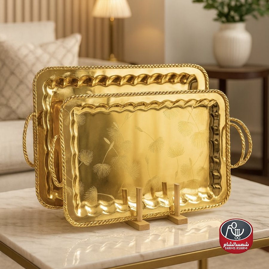 طقم صواني مستطيل مطلي باللون الذهبي اللامع، متوفر بمقاسين 37×26 سم و 43×30 سم. تصميم عملي يجمع بين الفخامة وسهولة الاستخدام، مما يجعله الخيار المثالي لتقديم المشروبات والحلويات أو استخدامه كإضافة أنيقة لطاولة الضيافة