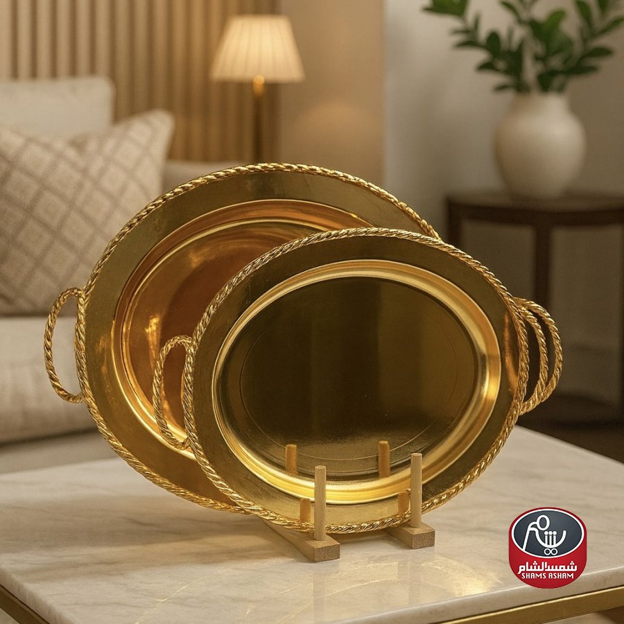 طقم صواني بيضاوي مميز باللون الذهبي الفخم، متوفر بمقاسين 40×30 سم و 48×33 سم. تصميمه الانسيابي يعكس الرقي، مما يجعله مثالياً لتقديم القهوة، العصائر، أو الحلويات في المناسبات الخاصة، بالإضافة إلى كونه قطعة ديكور تضفي جمالاً على طاولتك