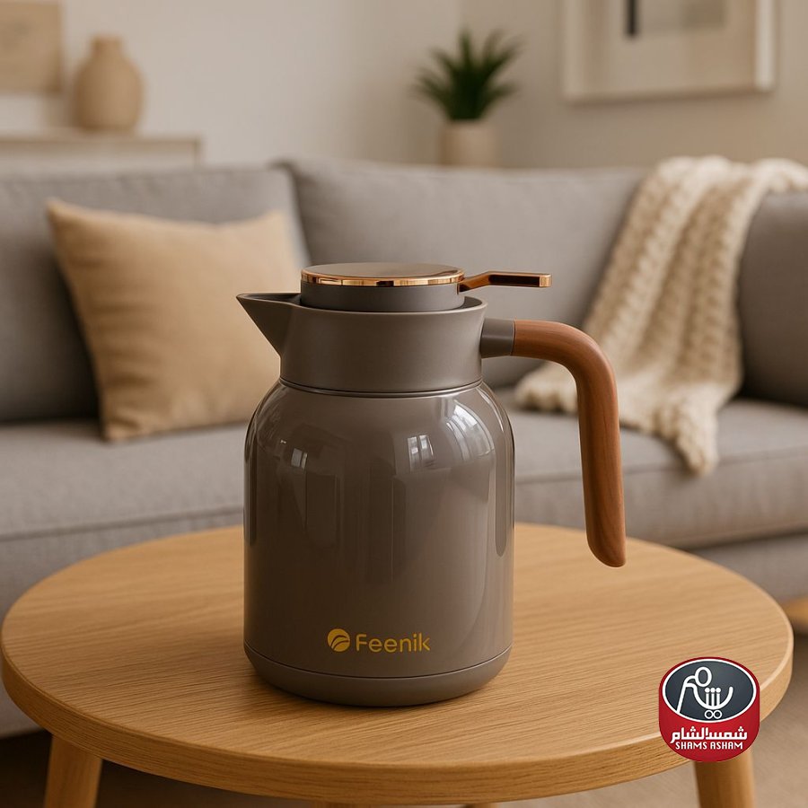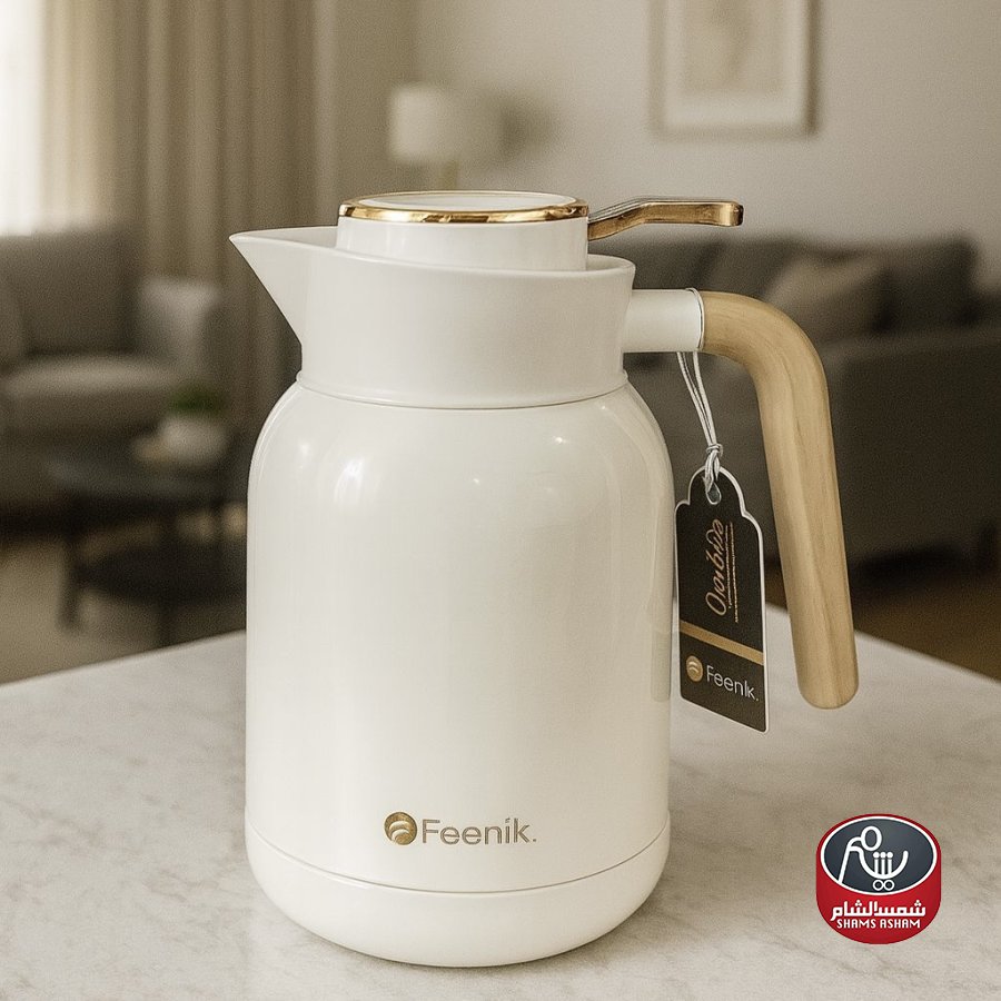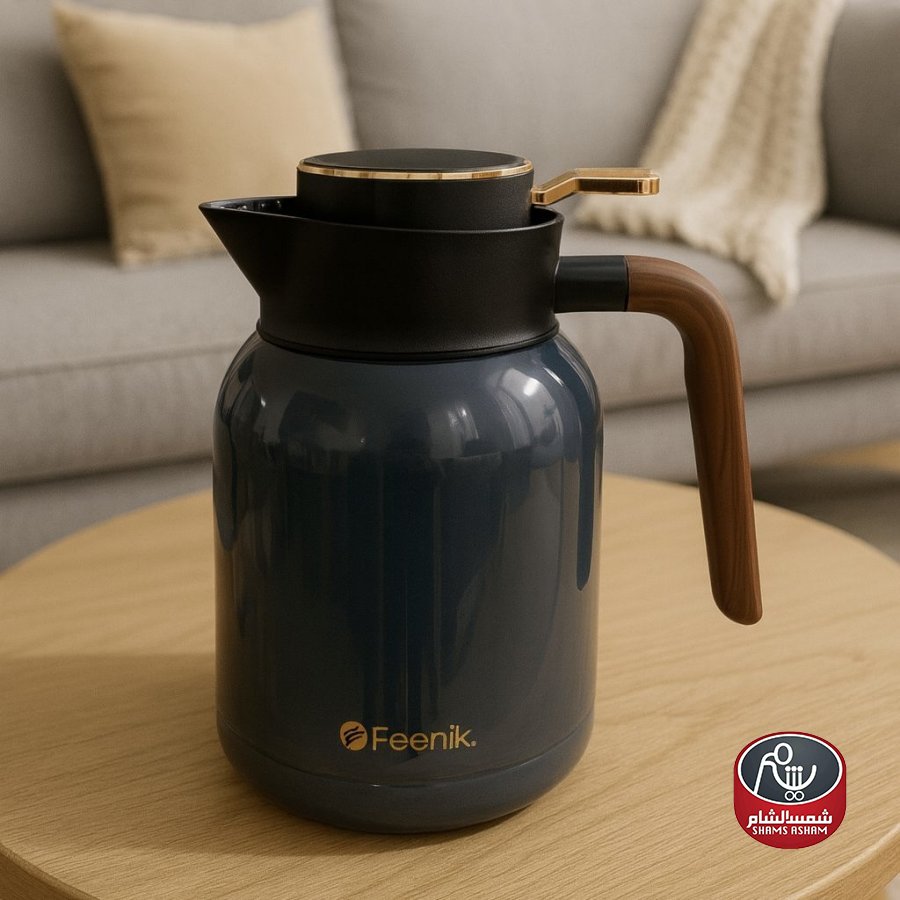 براد Feenik الحراري بسعة 1.5 لتر تصميم أنيق يجمع بين الفخامة والعملية، مصنوع من خامات عالية الجودة تحافظ على المشروبات ساخنة أو باردة لساعات طويلة. يتميز بغطاء محكم الإغلاق مع لمسات ذهبية راقية، بالإضافة إلى مقبض خشبي مريح يمنحك سهولة في الاستخدام اليومي. متوفر بثلاثة ألوان عصرية (أزرق داكن، رمادي، أبيض) ليضفي لمسة جمالية على أي مجلس أو جلسة ضيافة، مما يجعله الخيار المثالي للاستعمال المنزلي أو المناسبات الخاصة.