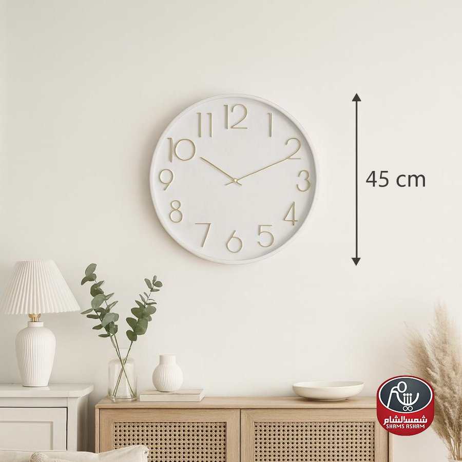 ساعة حائط أنيقة بتصميم عصري بسيط، قطرها 45 سم باللون الأبيض مع أرقام بارزة باللون الذهبي، ما يجعلها قطعة عملية وديكورية في الوقت نفسه. تناسب غرفة المعيشة، غرفة النوم أو حتى المكتب، وتضيف لمسة راقية للمكان مع سهولة في قراءة الوقت من مسافة بعيدة