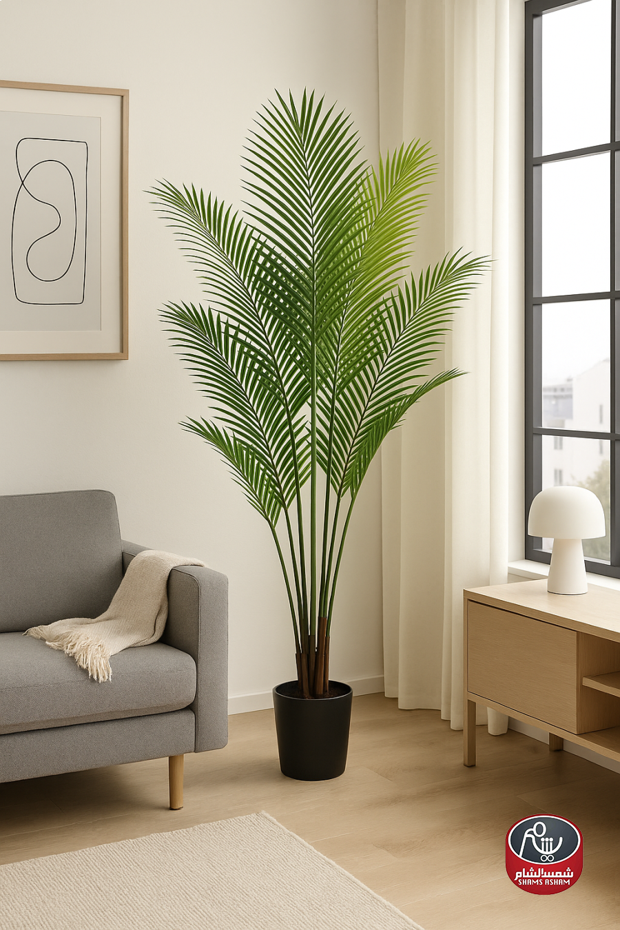 شجرة نخيل صناعية فاخرة بتصميم عصري وأوراق ريشية خضراء كثيفة تعطي مظهراً طبيعياً وحيوياً للديكور الداخلي، مزروعة في أصيص أنيق يناسب جميع أنماط الأثاث المنزلي. مثالية لوضعها في الصالونات، المكاتب أو زوايا البيت لإضفاء لمسة استوائية مميزة، سهلة النقل والترتيب، وتُحافظ على جمالها الأخضر طوال العام دون أي عناية أو ري. تعتبر خياراً عملياً وراقيًا لإضافة أجواء طبيعية ومنعشة للمنزل أو مكان العمل