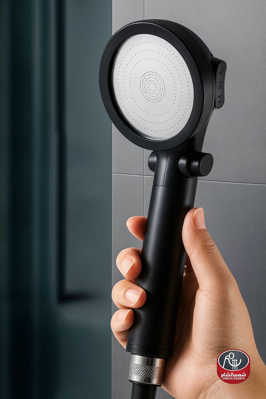 دش يدوي عصري بتصميم أنيق باللون الأسود المطفي، مصنوع من خامات عالية الجودة مقاومة للصدأ.