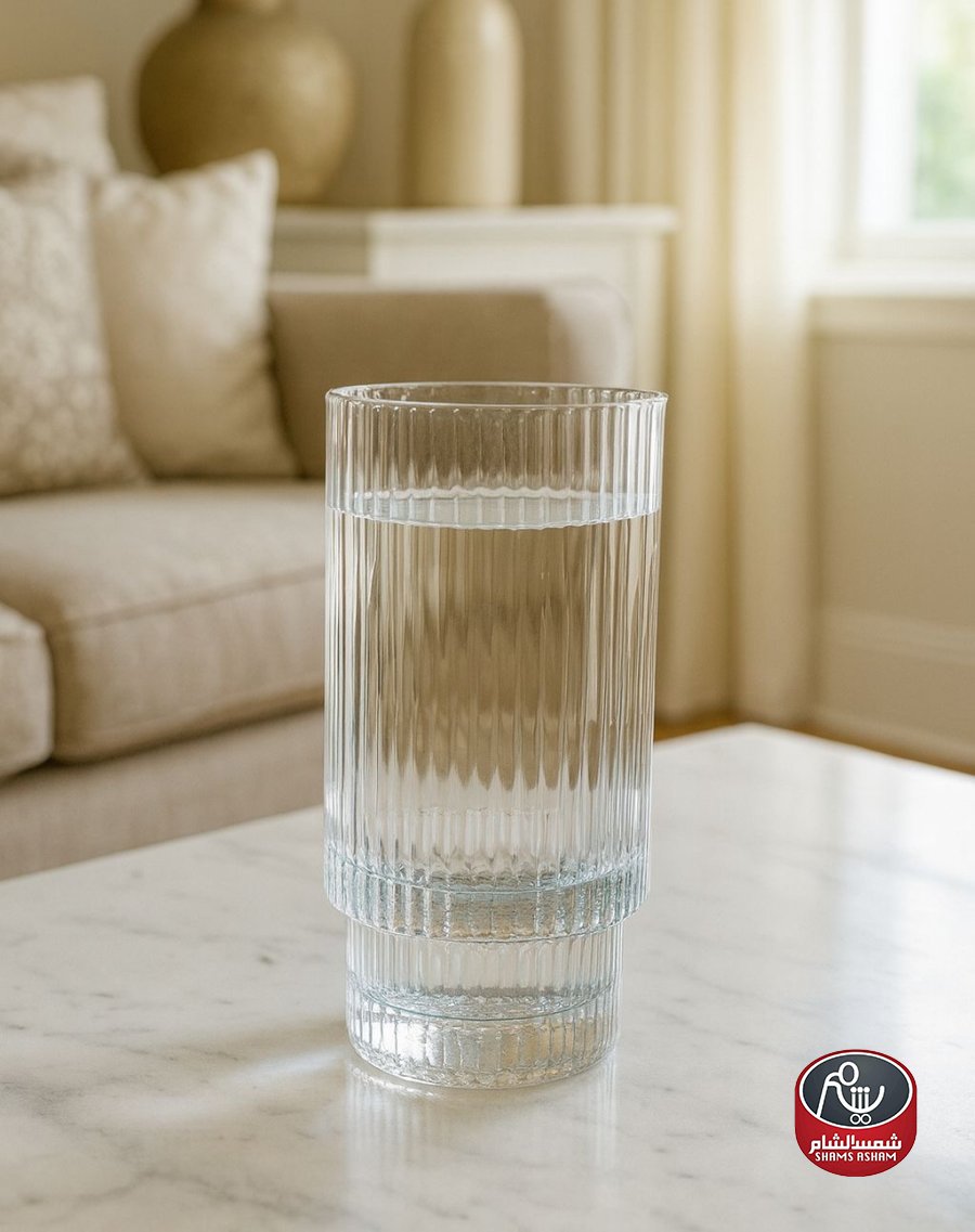 طقم من 6 كاسات زجاجية بتصميم طويل وأنيق، مصنوع من زجاج شفاف عالي الجودة بنقشة طولية تضيف لمسة فخمة وعصرية، مناسب لتقديم الماء أو العصير في الاستخدام اليومي أو للمناسبات الخاصة