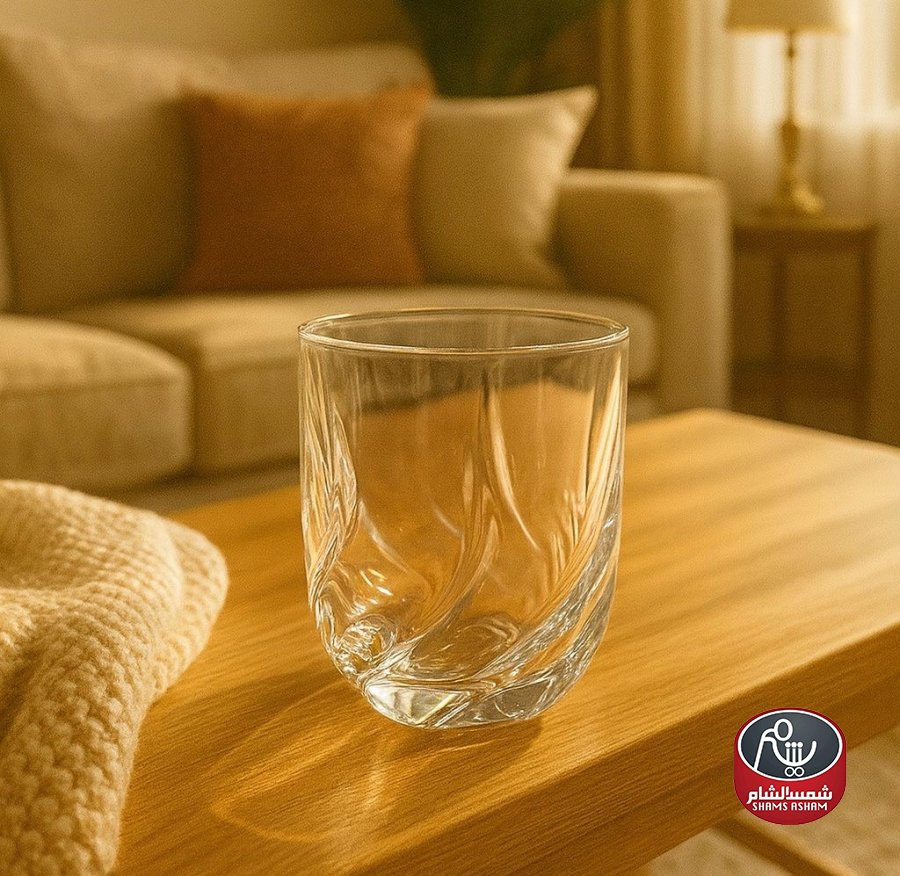 طقم مكون من 6 كاسات زجاجية أنيقة بتصميم عصري مميز بتعرجات فنية تضيف لمسة فخمة على الطاولة، مصنوع من زجاج شفاف عالي الجودة، مناسب لتقديم العصير أو الماء في الاستخدام اليومي أو المناسبات الخاصة.