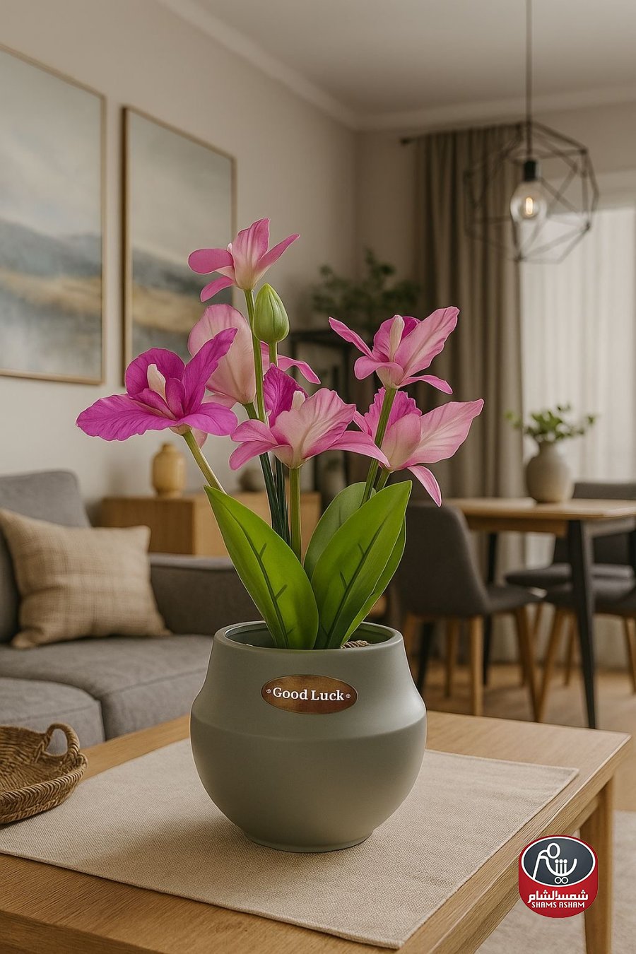 زهرة ديكور صناعية بتصميم أنيق تضيف لمسة جمال فورية لأي زاوية في المنزل أو المكتب، داخل أصيص مميز مكتوب عليه Good Luck ليمنح المكان طاقة إيجابية ولمسة راقية. تأتي بارتفاع تقريبًا 40 سم وقطر أصيص 16 سم، بأوراق وزهور واقعية وتفاصيل ناعمة لا تحتاج أي عناية أو سقاية. مثالية لطاولات الجلوس، المداخل، غرف النوم والمكاتب، وتبقى دائماً نابضة بالحياة بلا مجهود. 🌿