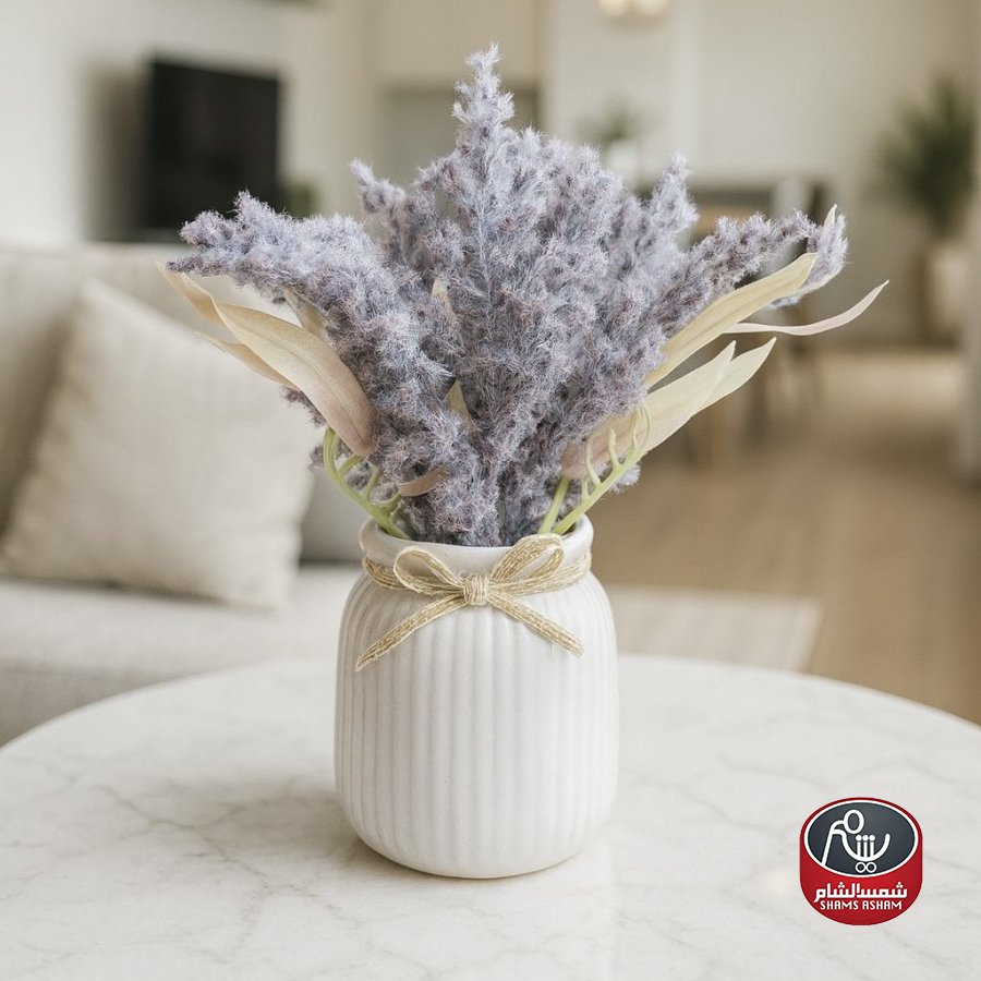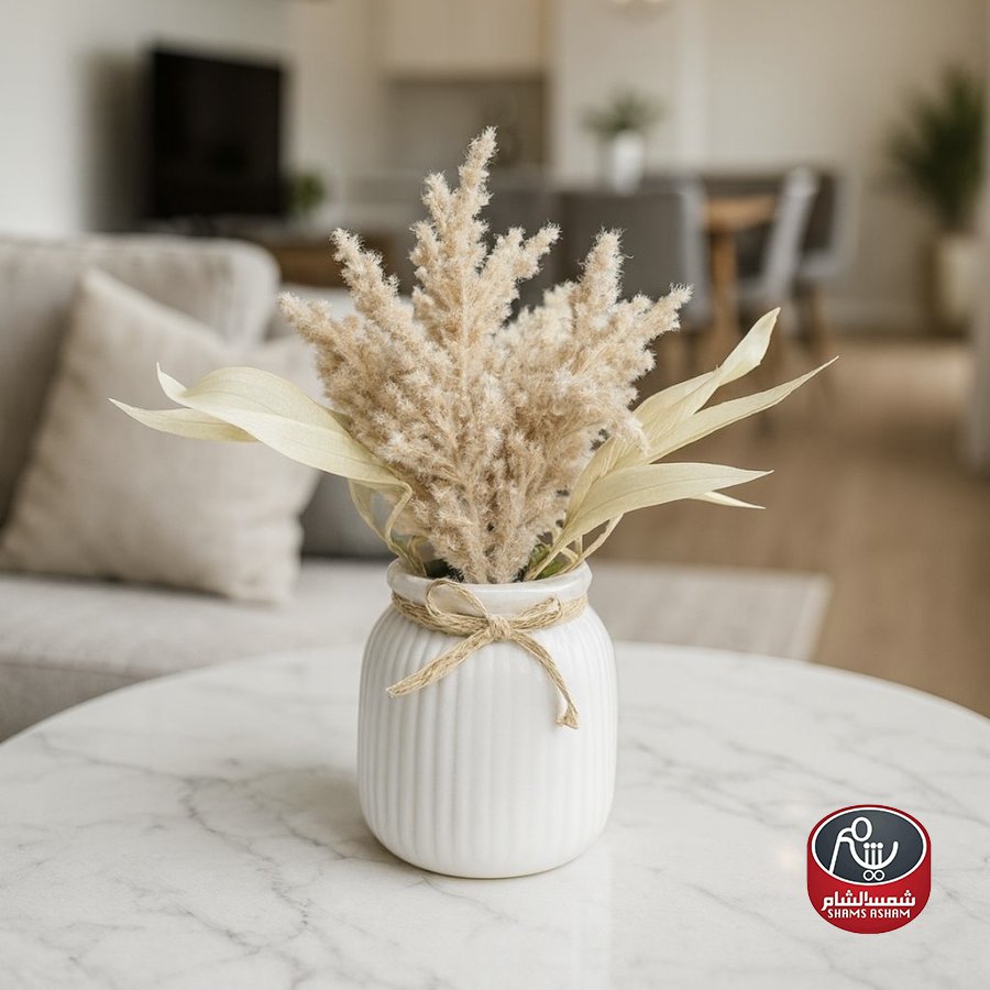 مزهرية سيراميك بتصميم مخطط أنيق مع ربطة خيش جمالية، تحتوي على تنسيق زهور يابسة صناعية بجودة عالية تمنح لمسة طبيعية ودافئة للديكور دون أي عناية. مناسبة لغرف الجلوس، الصالون، المداخل والمكاتب. الارتفاع 20 سم – القطر 9 سم، متوفرة بعدة تنسيقات زهور كما في الصور