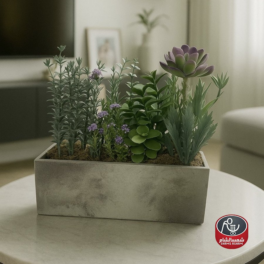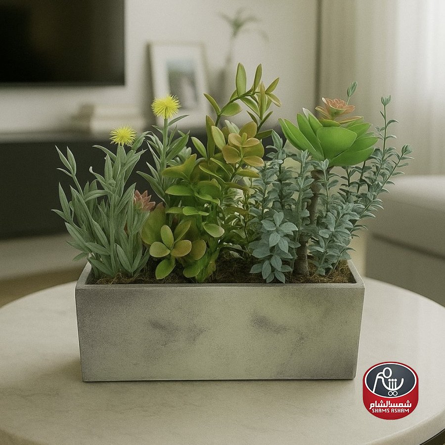 مجموعة نباتات صناعية فاخرة داخل قوارة مستطيلة بتصميم رخامي أنيق، عرض 23 سم وارتفاع 25 سم، تضم تنسيقة متنوعة من النباتات العصارية والأزهار الصغيرة بألوان نابضة بالحياة تمنح المكان لمسة طبيعية جذّابة دون أي عناء عناية. مناسبة لغرف الجلوس، المكاتب، الطاولات الجانبية ومدخل المنزل، ثابتة وسهلة التنظيف وتبقى خضراء وجميلة طوال الوقت