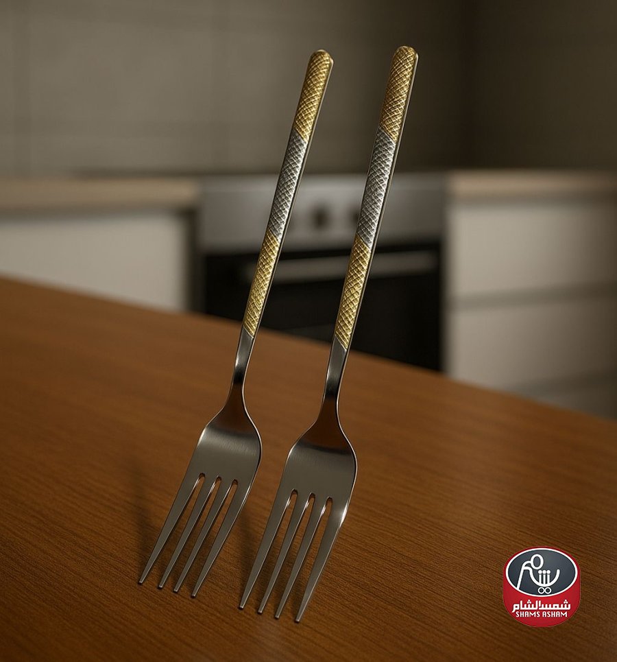 طقم شوك ستانلس ستيل أصلي وثقيل بجودة ممتازة، يتميّز بمقبض بنقشة محفورة بتصميم ثنائي اللون يجمع بين الذهبي والفضي بشكل مائل يمنح الشوكة مظهراً فاخراً وعصرياً. يتوفر بطقم كبير وطقم صغير، وكل طقم يحتوي على 6 قطع مقاومة للحرارة وللغسيل المتكرر ولا تتأثر بالجلاي أو أي استعمال يومي، مما يجعله خياراً عملياً وأنيقاً للسفرة والضيافة