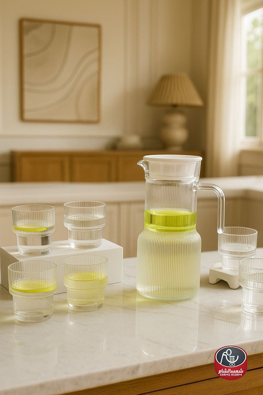 شربة زجاج مع ٦ كاسات بتصميم عصري ومموج أنيق، مصنوعة من زجاج شفاف عالي الجودة يعطي شكل راقٍ على السفرة. الشربة سعتها ممتازة للاستخدام اليومي أو للضيافة، مع يد مريحة وسكب سهل بدون انسكاب. الكاسات المتناسقة معها بتيجي نفس اللمسة المموجة لإطلالة موحدة وجميلة، ومناسبة للعصائر، الماء والمشروبات الباردة. خيار مثالي للاستخدام داخل المنزل أو للمناسبات.