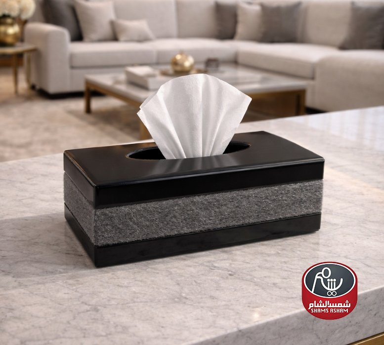 علبة مناديل بتصميم عصري باللون الأسود تضيف لمسة أنيقة للمكان.
