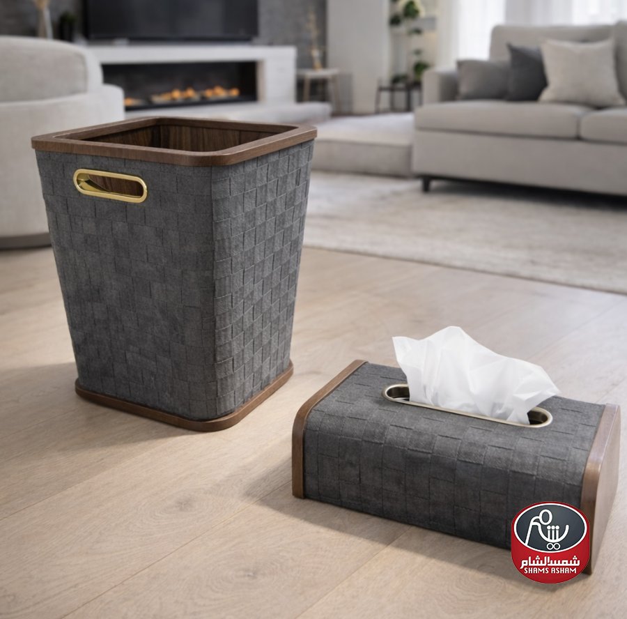 طقم سلة مهملات وبكيت محارم بتصميم عصري بنقشة نسجية أنيقة تناسب الديكور الحديث.