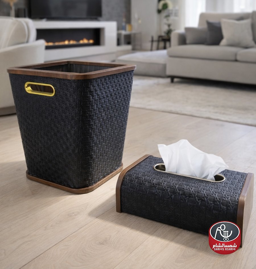 طقم سلة مهملات وبكيت محارم بتصميم عصري بنقشة نسجية أسود أنيق يناسب الديكور الحديث.