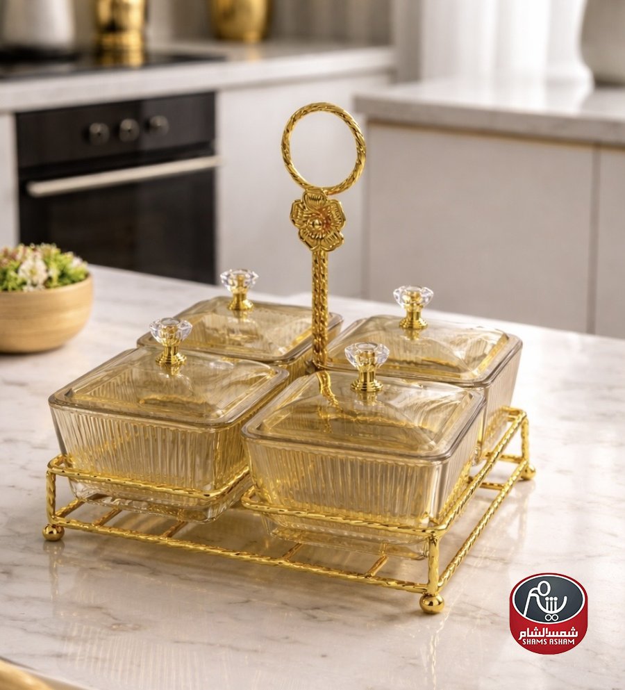 مزود بأغطية زجاجية بمقابض كريستالية للحفاظ على المحتوى بشكل مرتب وجذاب.
