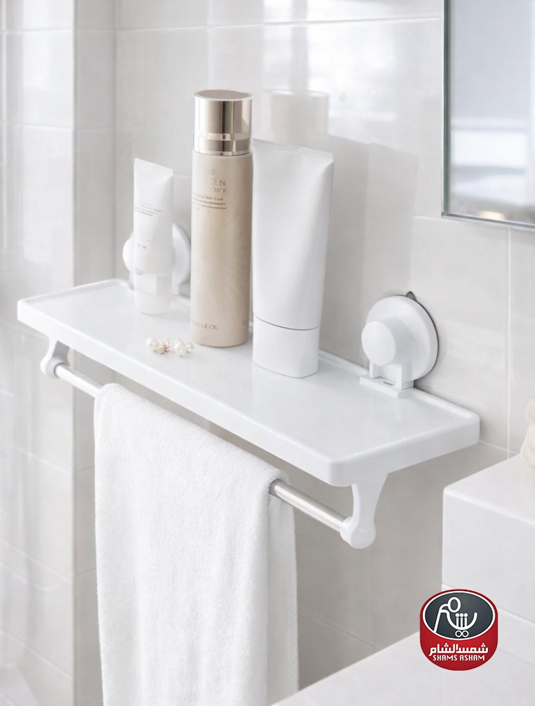 رف أنيق وعملي للحمام، يثبت بسهولة على الحائط ومناسب لترتيب مستلزمات العناية اليومية مع حامل للمناشف.