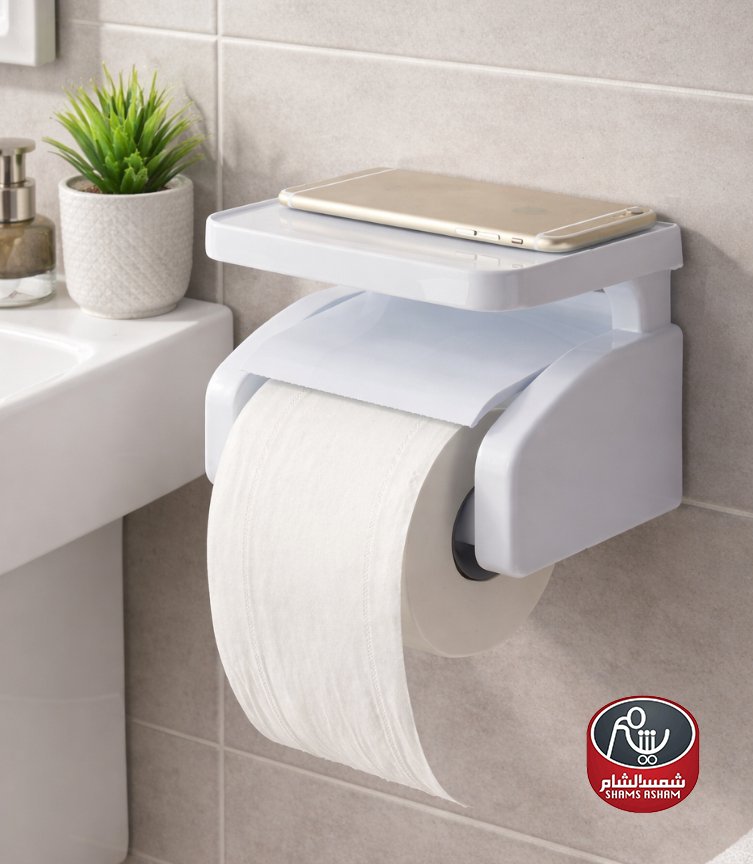 حامل عملي وأنيق للحمام مع رف علوي لوضع الهاتف أو الإكسسوارات، يثبت بسهولة على الحائط بدون حفر.