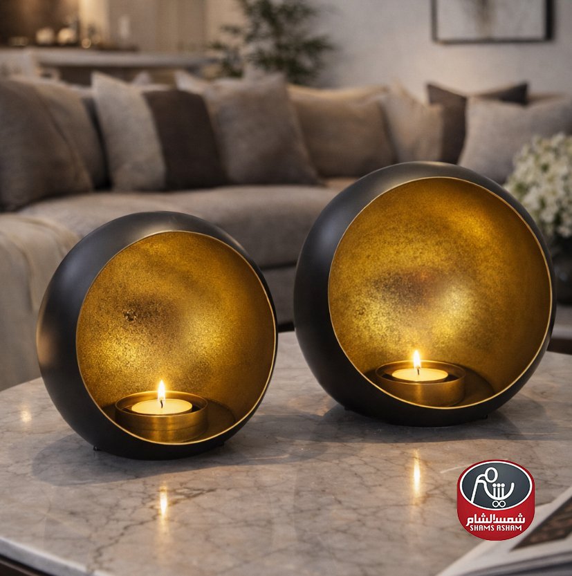 طقم شمعدان ديكور بتصميم دائري عصري باللون الأسود مع داخلية ذهبية تعكس ضوء الشموع بشكل دافئ وجذاب. قطعة أنيقة تضيف لمسة فخامة وهدوء على الطاولات والرفوف وتناسب مختلف أنماط الديكور.