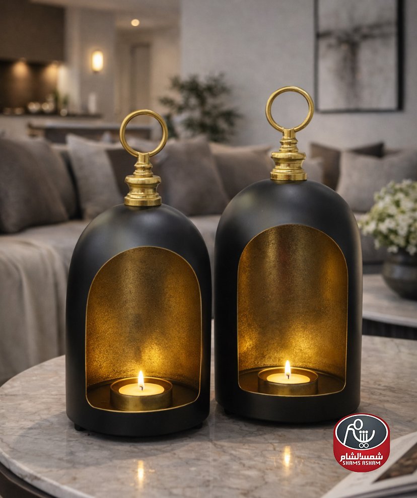 طقم فوانيس شموع بتصميم أنيق باللون الأسود مع لمسة داخلية ذهبية تعكس الإضاءة بشكل دافئ وراقٍ. مثالي لتزيين الطاولات والرفوف وإضفاء أجواء هادئة وفاخرة على المساحات الداخلية.
