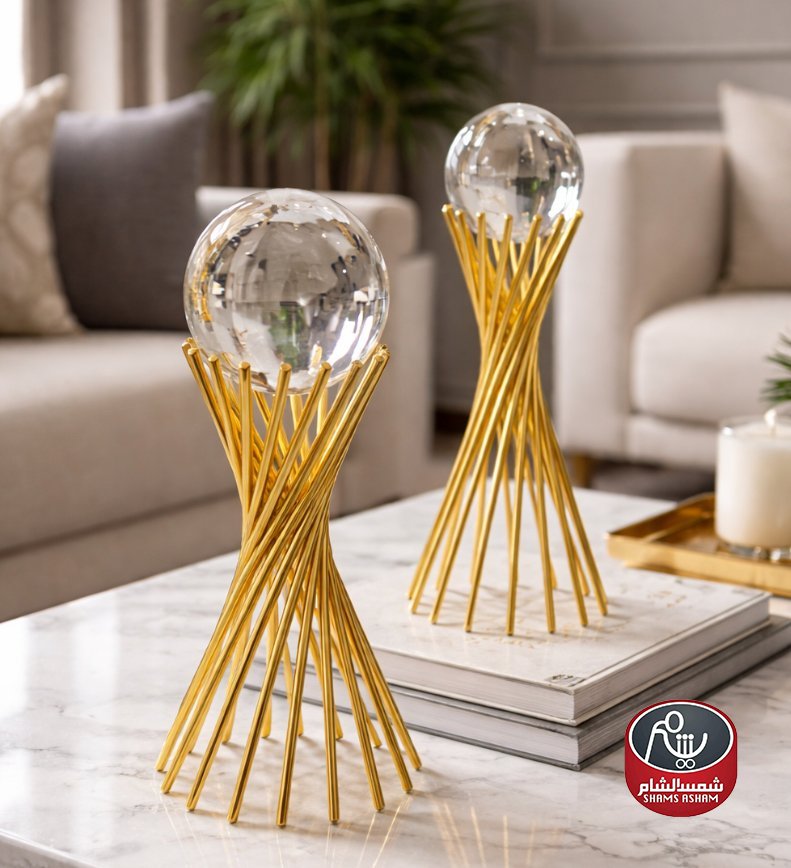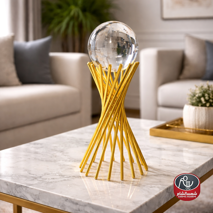 قطعة ديكور أنيقة بتصميم ذهبي عصري مزوّدة ببلورة شفافة تضيف لمسة فخامة ولمعان راقٍ للمكان. مثالية لتزيين الطاولات والرفوف وتنسجم مع مختلف أنماط الديكور العصري والكلاسيكي.