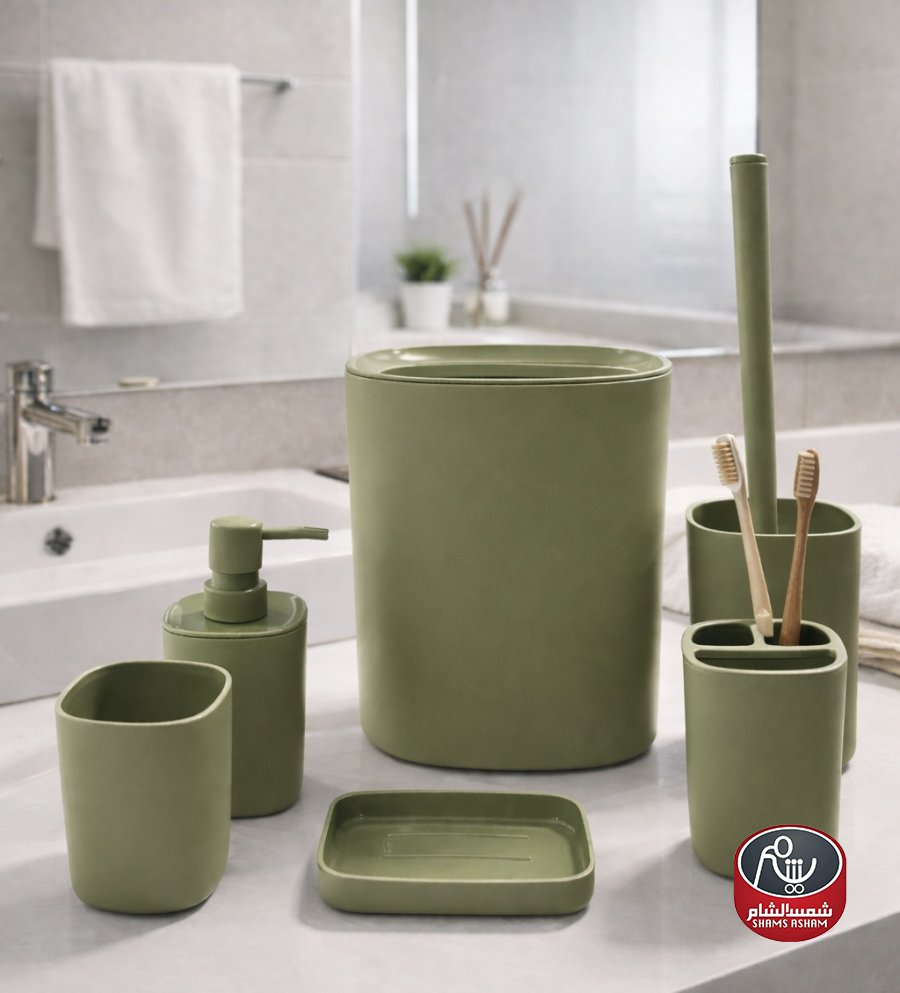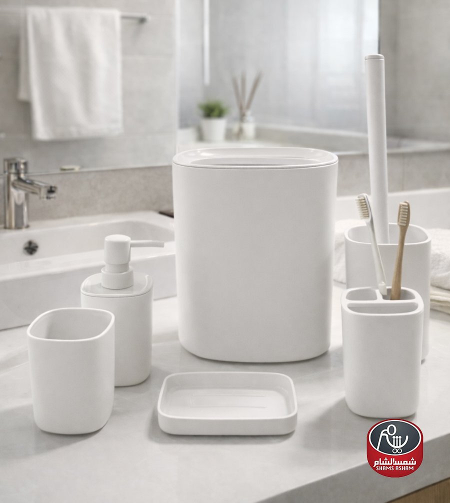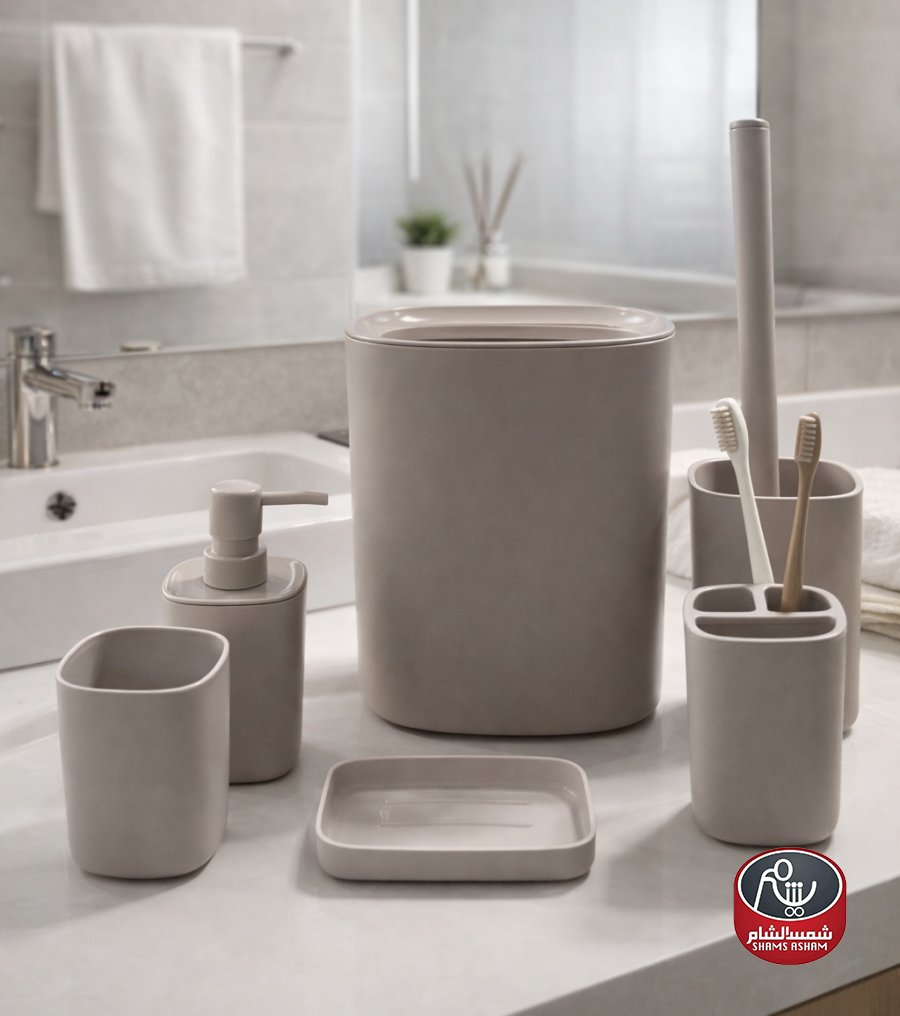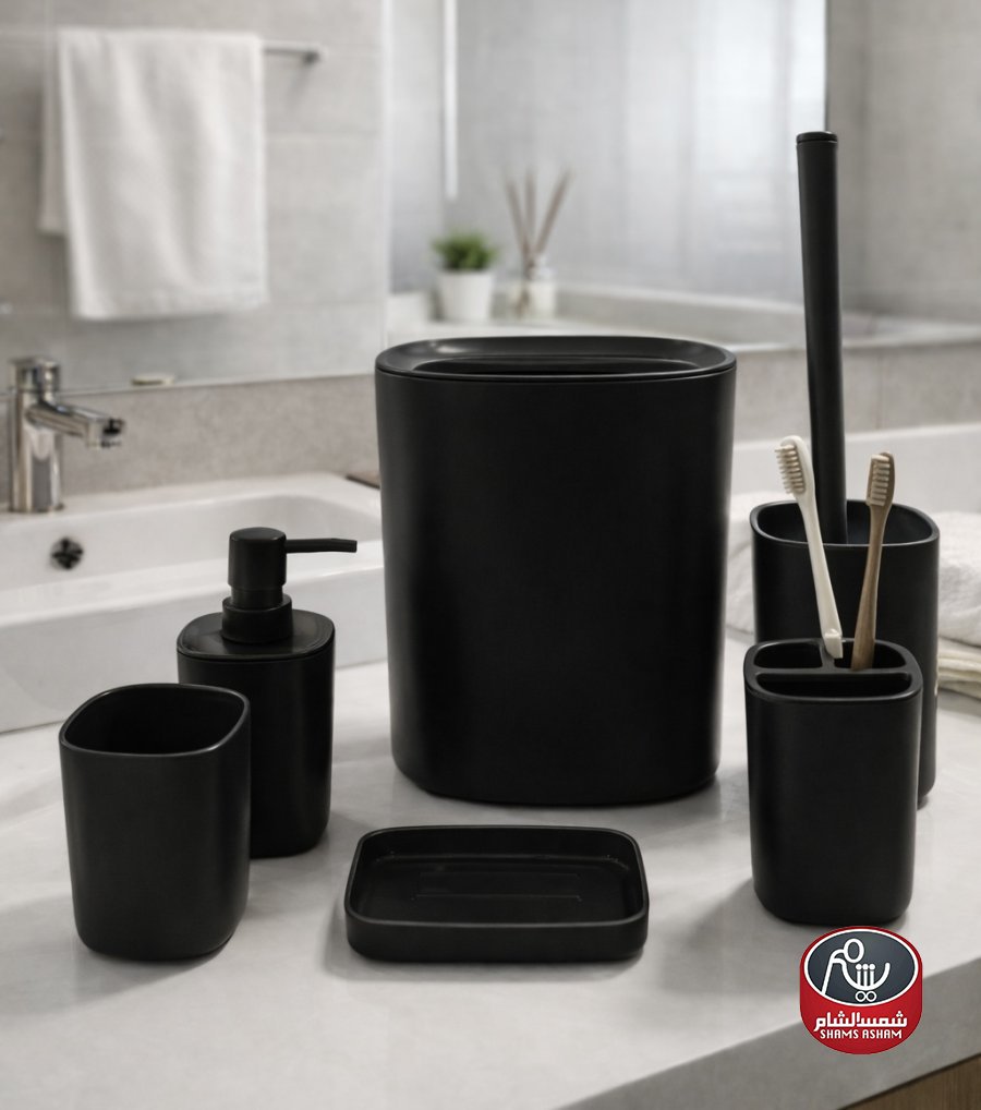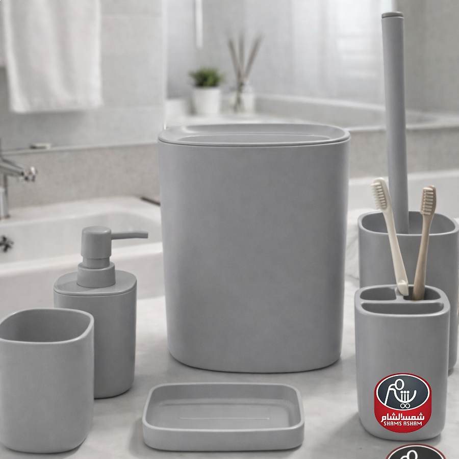يتكوّن الطقم من سلة مهملات، علبة صابون سائل، كوب، حامل فرش أسنان، وفرشاة مرحاض مع حامل، ليكون حلاً متكاملاً لتنسيق الحمّام بأسلوب عصري ومرتب