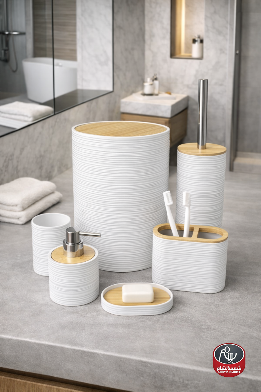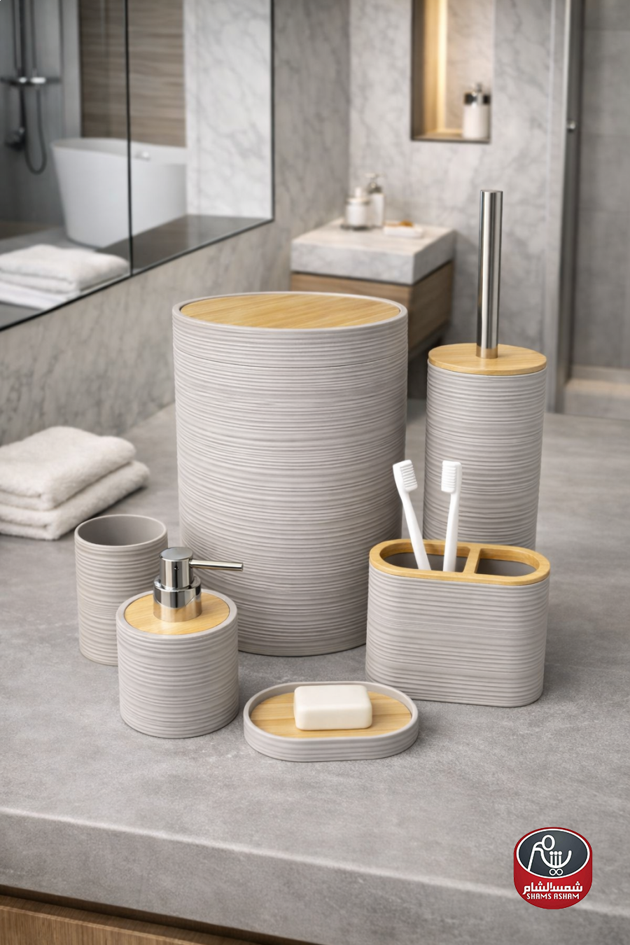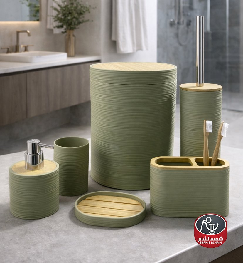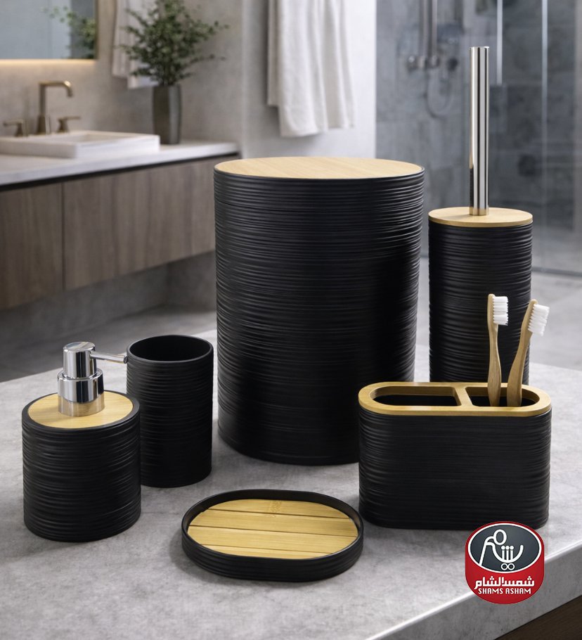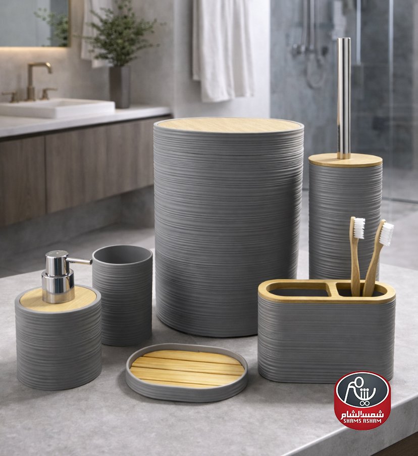طقم إكسسوارات حمّام بتصميم مودرن أنيق مع لمسات خشبية طبيعية تضيف إحساساً دافئاً وراقياً. يتميز بملمس مخطط عصري ومصنوع من مواد عالية الجودة مقاومة للرطوبة وسهلة التنظيف.