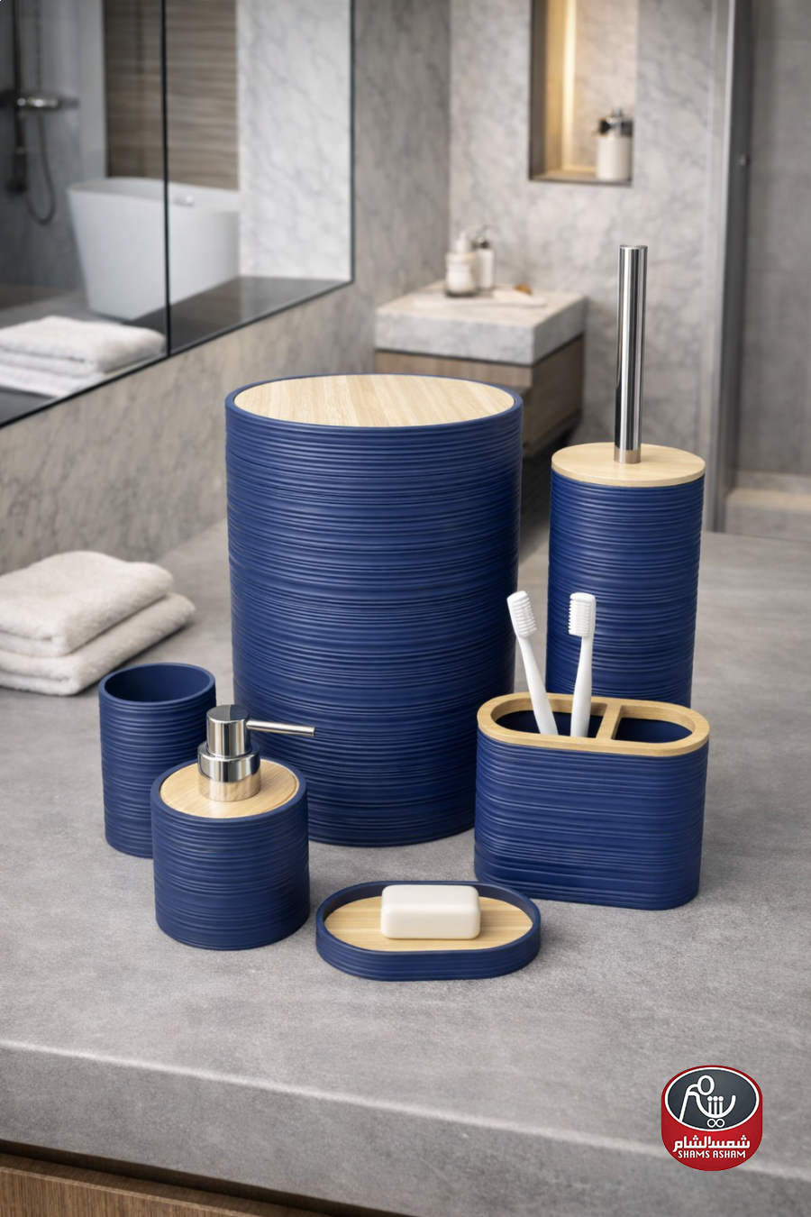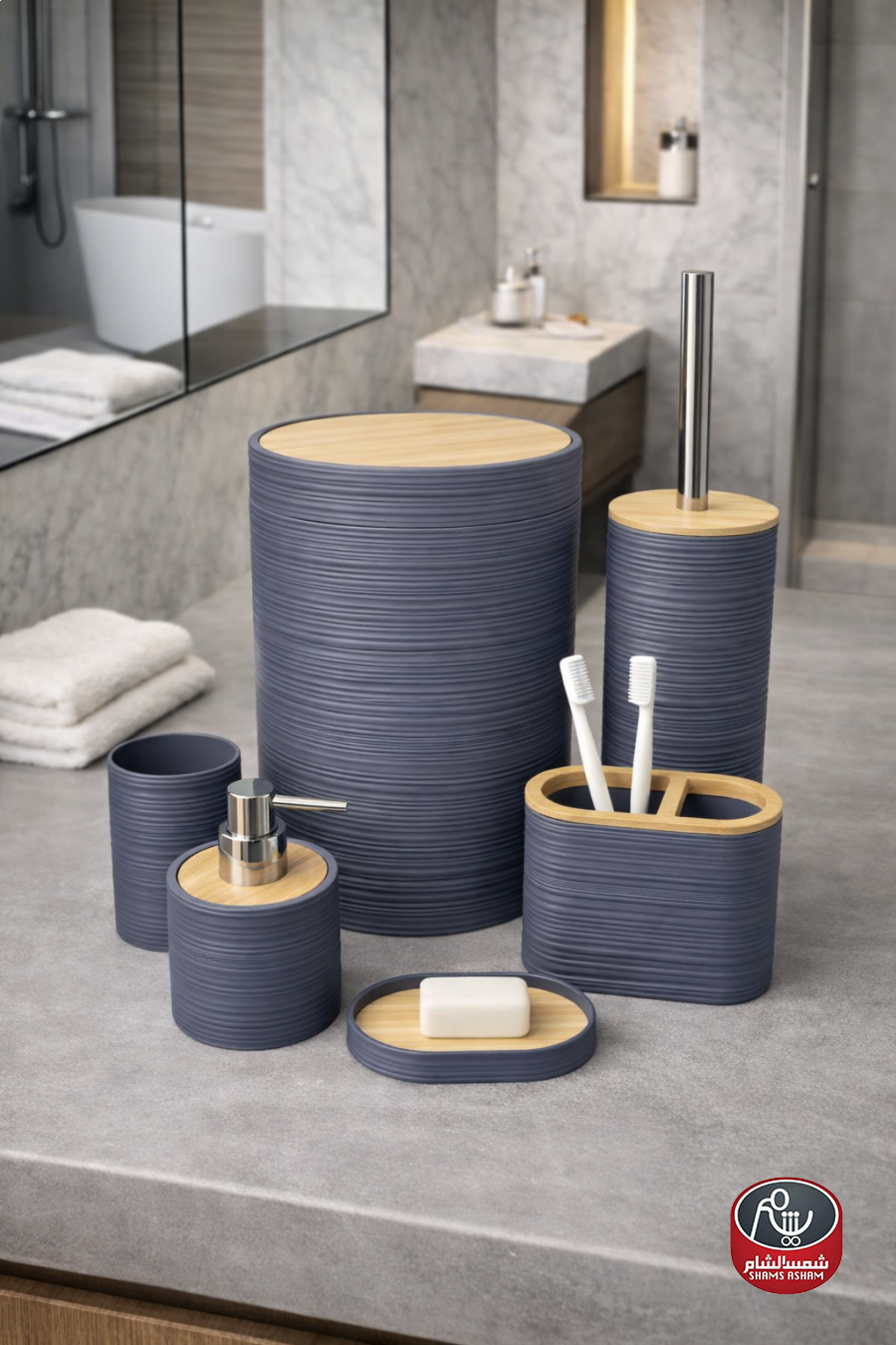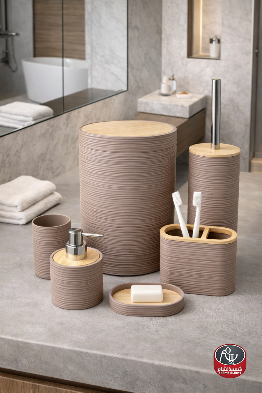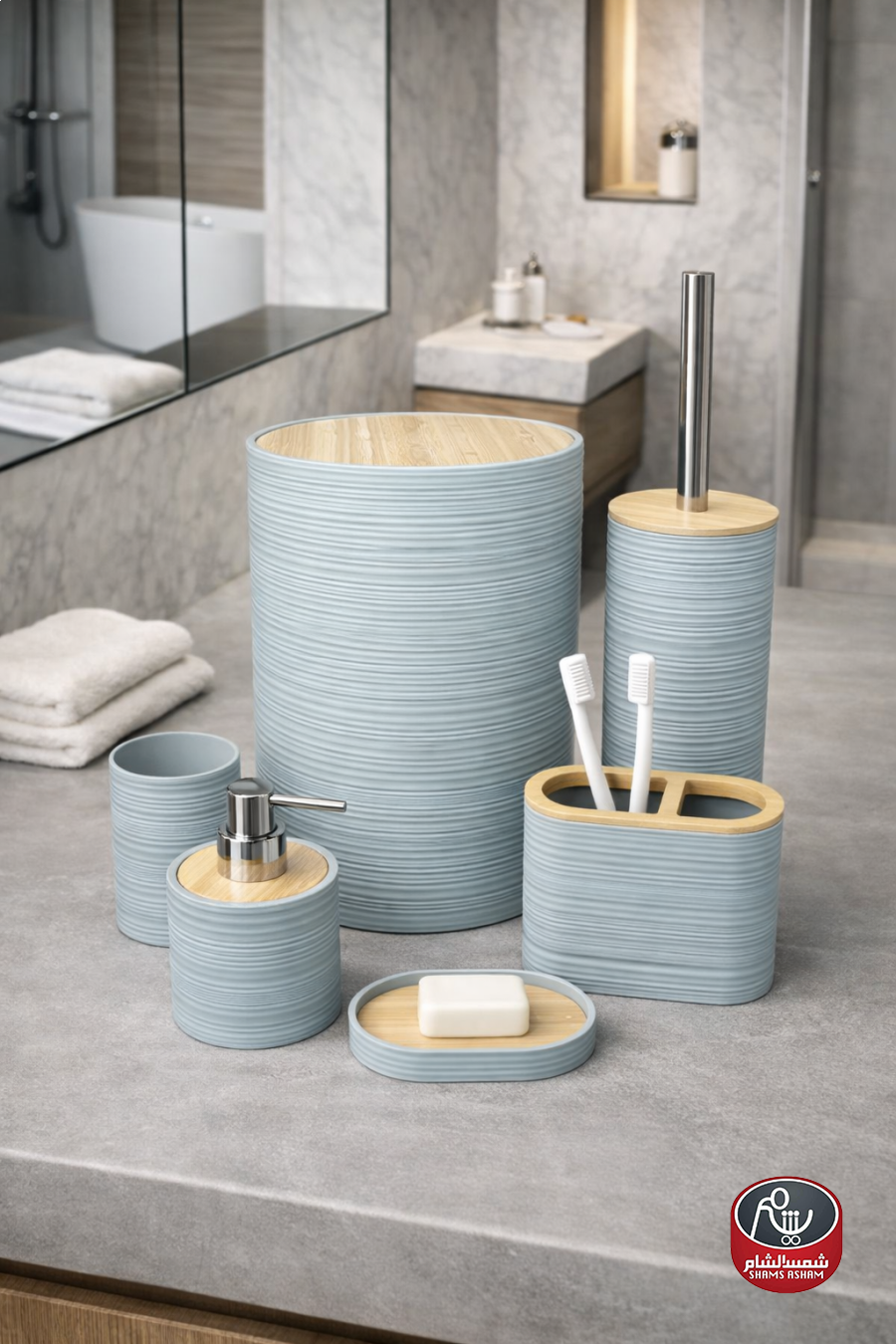 طقم إكسسوارات حمّام بتصميم مودرن أنيق مع لمسات خشبية طبيعية تضيف إحساساً دافئاً وراقياً. يتميز بملمس مخطط عصري ومصنوع من مواد عالية الجودة مقاومة للرطوبة وسهلة التنظيف.