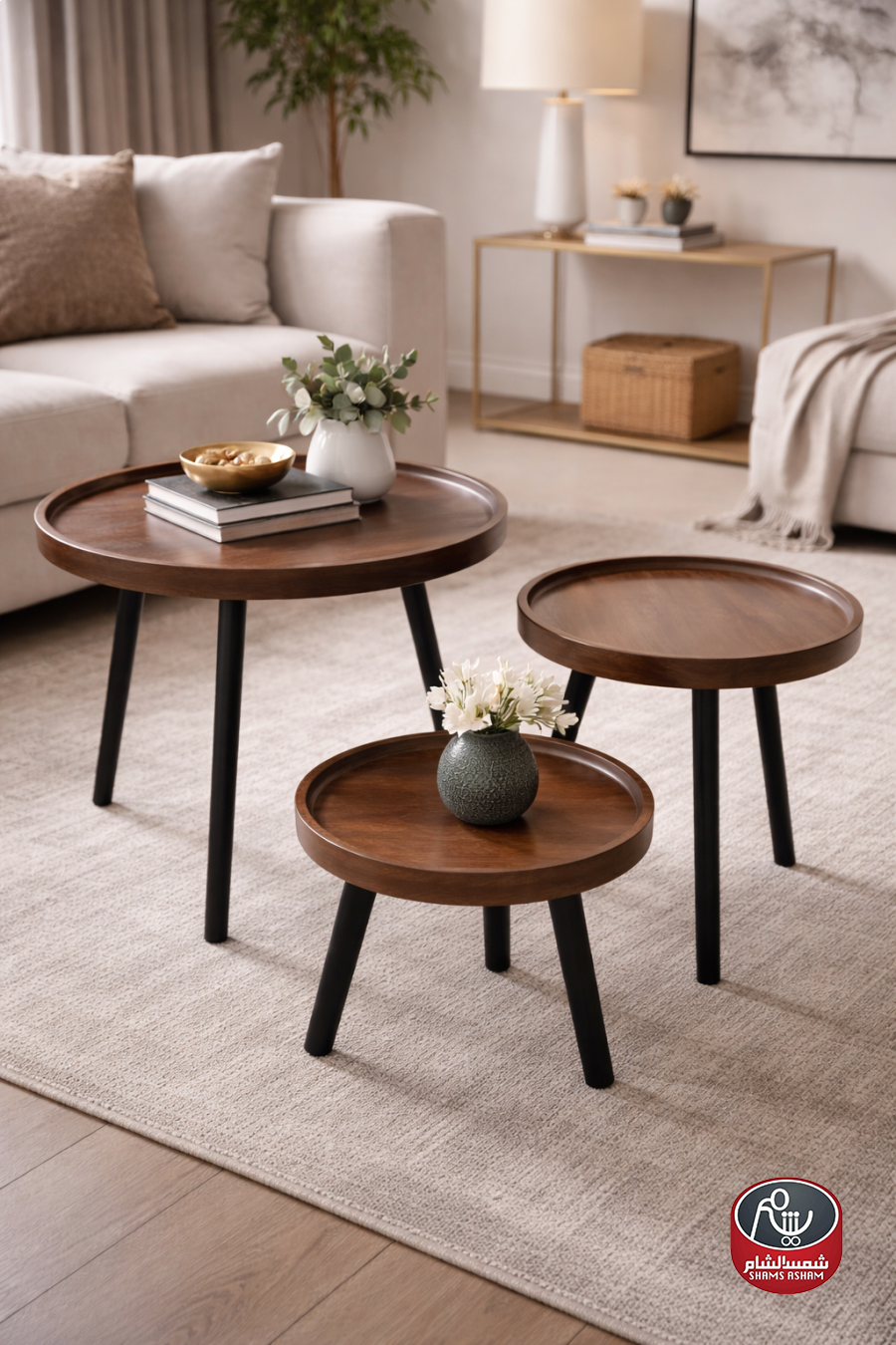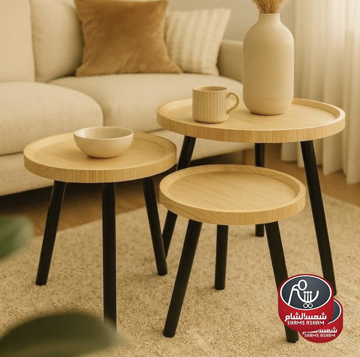 طقم طاولات جانبية خشبية بتصميم مودرن أنيق، يتميز بسطح دائري بحافة مرتفعة وقواعد ثابتة باللون الأسود، ليضيف لمسة دفء وفخامة لأي غرفة معيشة. مثالي للاستخدام اليومي ويمنح مرونة في الترتيب والتنسيق داخل المساحات العصرية.