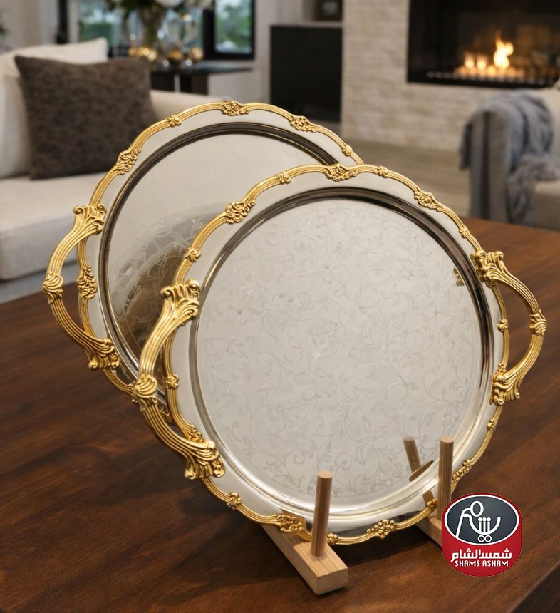 طقم صواني تقديم دائرية بتصميم فاخر ولمسة ذهبية أنيقة، مثالي لتقديم الضيافة والحلويات بأسلوب راقٍ. يتميز بحواف مزخرفة ومقابض جانبية لسهولة الحمل، ويضيف فخامة واضحة لطاولة التقديم في المناسبات اليومية والخاصة.