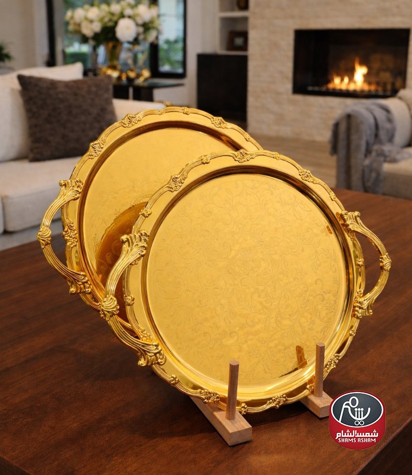 طقم صواني تقديم دائرية بتصميم فاخر ذهبية أنيقة، مثالي لتقديم الضيافة والحلويات بأسلوب راقٍ. يتميز بحواف مزخرفة ومقابض جانبية لسهولة الحمل، ويضيف فخامة واضحة لطاولة التقديم في المناسبات اليومية والخاصة.