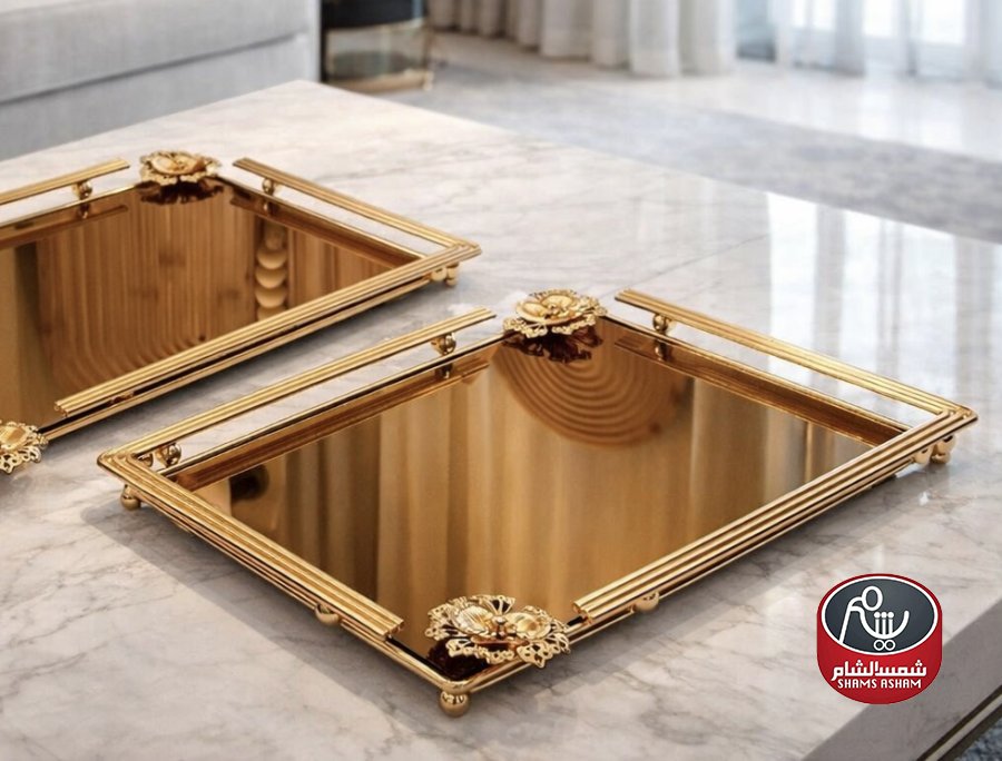 طقم صواني مرايا بتصميم أنيق وفاخر، مصنوع من مرايا عاكسة عالية الجودة مع إطار معدني ذهبي مزخرف يمنح لمسة فخامة للمكان. مثالي للتقديم، تنظيم الإكسسوارات، أو للديكور على طاولة الضيافة أو التسريحة، ويضفي أناقة واضحة على أي مساحة.