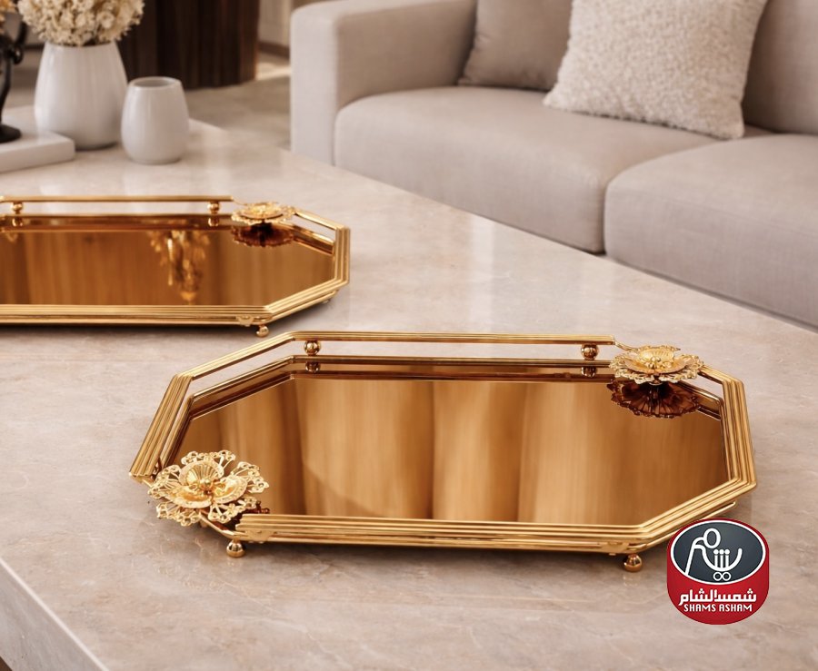 طقم صواني مرايا بتصميم ثماني أنيق، مصنوع من مرايا عاكسة عالية الجودة مع إطار معدني ذهبي مزخرف بتفاصيل وردية راقية وقاعدة ثابتة بأرجل صغيرة. مناسب للتقديم والضيافة أو كقطعة ديكور فخمة على طاولة الصالون أو السفرة، ويضيف لمسة أناقة وفخامة للمكان.