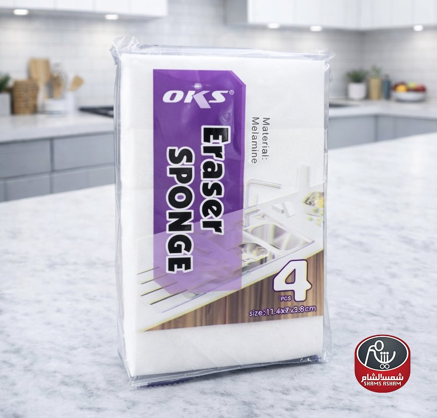 إسفنجة ممحاة OKS Eraser Sponge مصنوعة من مادة الميلامين، مثالية لإزالة البقع الصعبة والأوساخ العنيدة بسهولة ودون مواد كيميائية، مناسبة للمطبخ والحمام والأسطح المختلفة، العبوة تحتوي على 4 قطع