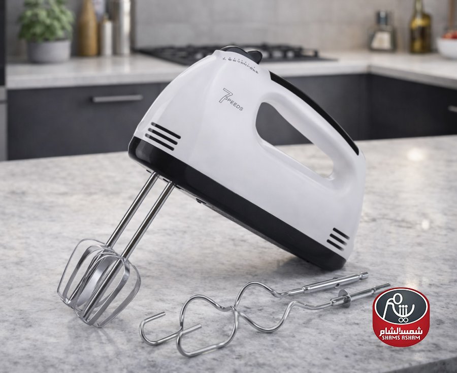 خلاط يدوي كهربائي بقوة 260 واط مع 7 سرعات للتحكم السلس حسب نوع الخلط، مناسب لخفق البيض والكريمة وخلط العجين الخفيف والمكونات المختلفة. تصميم عملي وسهل الحمل، يأتي مع مضارب وخطافات عجن لراحة أكبر في الاستخدام اليومي داخل المطبخ
