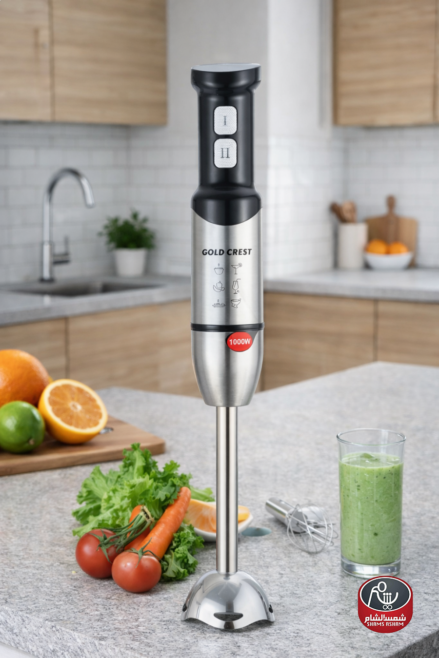 خلاط يدوي قوي بقدرة 1000 واط، مزود بشفرات ستانلس ستيل ومفتاح تشغيل سهل، مثالي لتحضير الشوربات، الصلصات وطعام الأطفال بسرعة وكفاءة
