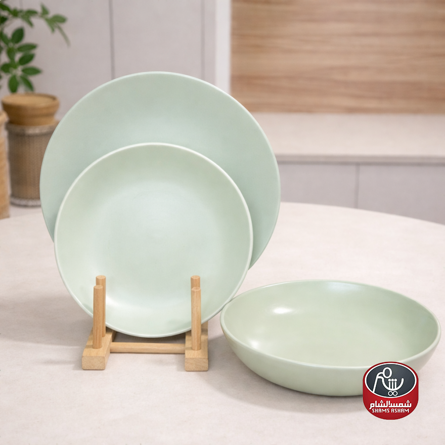 طقم صحون بتصميم بسيط وأنيق بلون أخضر فاتح هادئ، يتكوّن من 18 قطعة موزعة على 3 أحجام مختلفة (6 قطع من كل حجم)، مناسب للاستخدام اليومي والتقديم ويمنح مائدة الطعام لمسة عصرية وناعمة