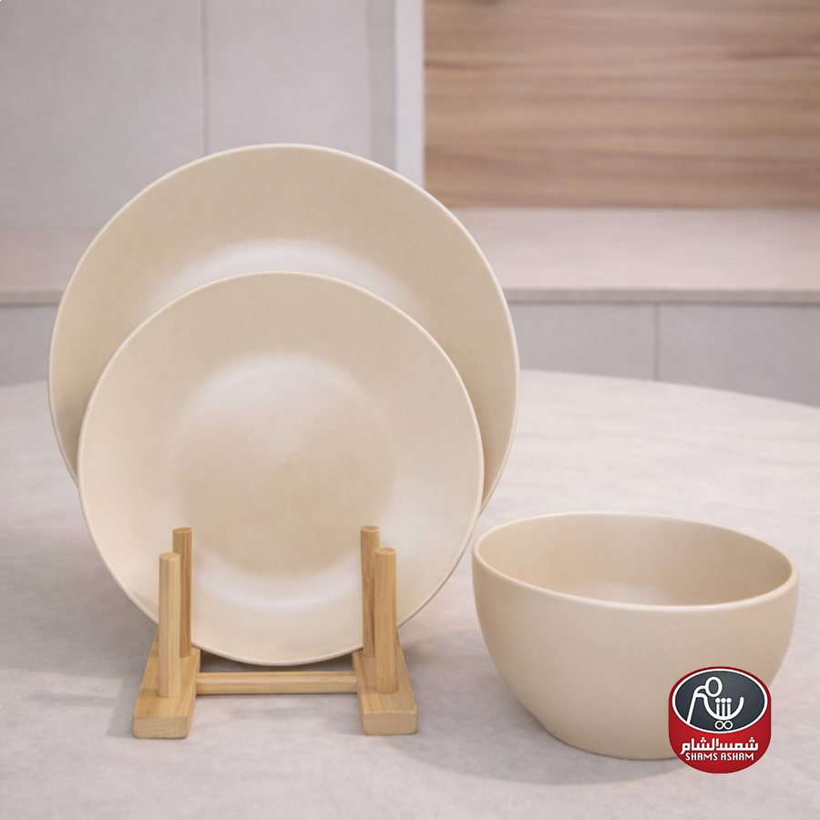 طقم صحون بتصميم بسيط وناعم بلون بيج فاتح دافئ، يتكوّن من 18 قطعة موزعة على 3 أحجام مختلفة (6 قطع من كل حجم)، مناسب للاستخدام اليومي والتقديم ويضفي لمسة هادئة وأنيقة على مائدة الطعام
