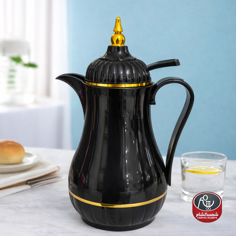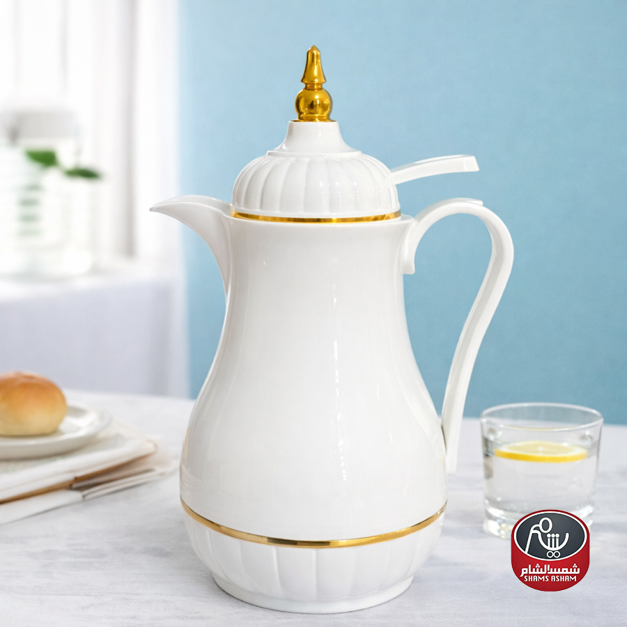 ثيرموس ضيافة فاخر سعة 1 لتر بتصميم أنيق ولمسة ذهبية مميزة، يحافظ على حرارة أو برودة المشروبات لفترة طويلة، مع مقبض مريح وسهولة في الصب—مثالي للبيت والضيافة