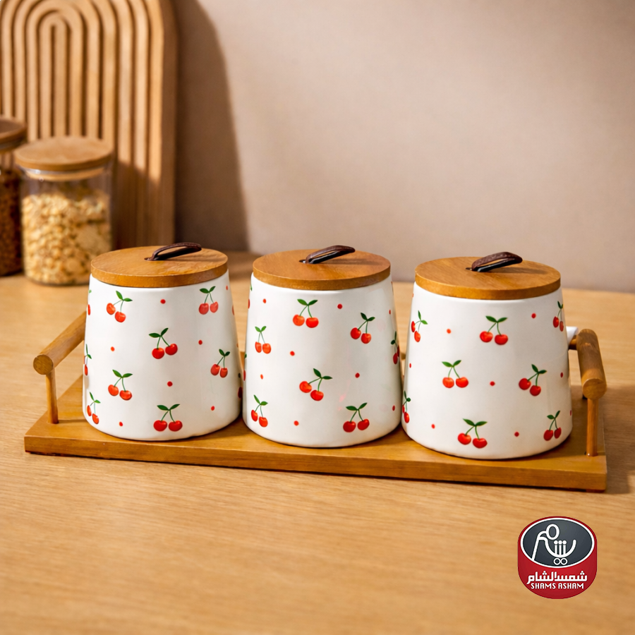 سكريات بورسلان بنقشة الكرز، مكوّن من 3 قطع مع أغطية خشبية محكمة وحامل خشبي أنيق.