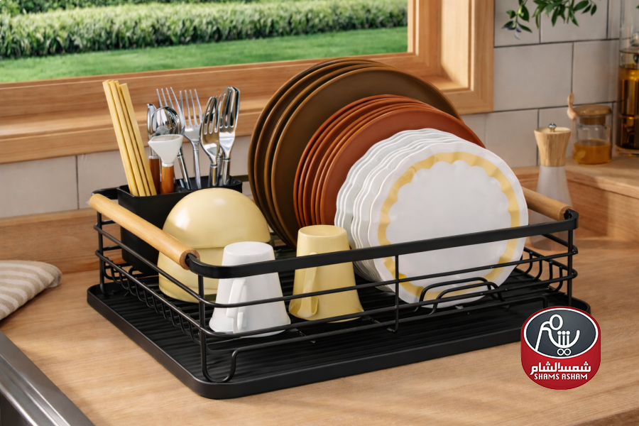 نشافة صحون عملية بتصميم مودرن مع قاعدة لتصريف وتجميع الماء، تساعد على تجفيف الأطباق والكاسات بسرعة وترتيب المطبخ بشكل أنيق. مزودة بحامل للملاعق والشوك ومقابض مريحة، سهلة التنظيف ومناسبة للاستخدام اليومي