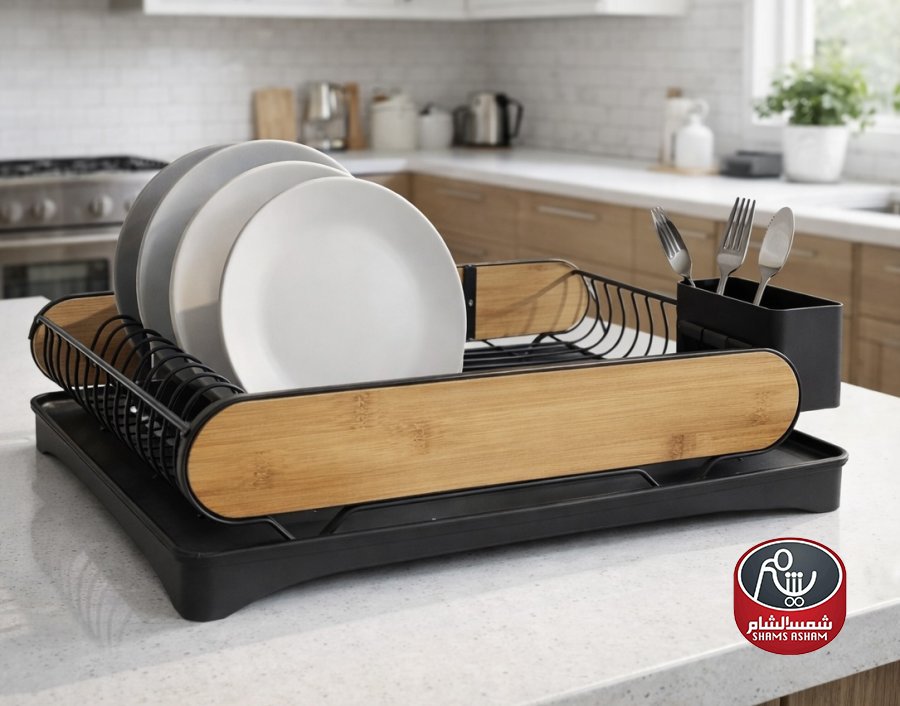 مجفف صحون بتصميم مودرن يجمع بين المعدن الأسود الأنيق ولمسة الخشب (بامبو)، مع صينية تجميع مياه سفلية ومصفاة لتثبيت الصحون بشكل منظم وحامل جانبي للمعالق والأدوات. عملي ويوفر مساحة على المجلى ويساعد على تجفيف الصحون بسرعة. المقاس: 42×30×13 سم
