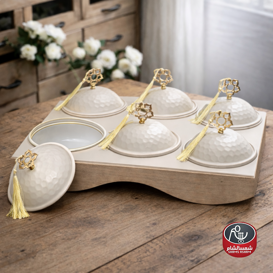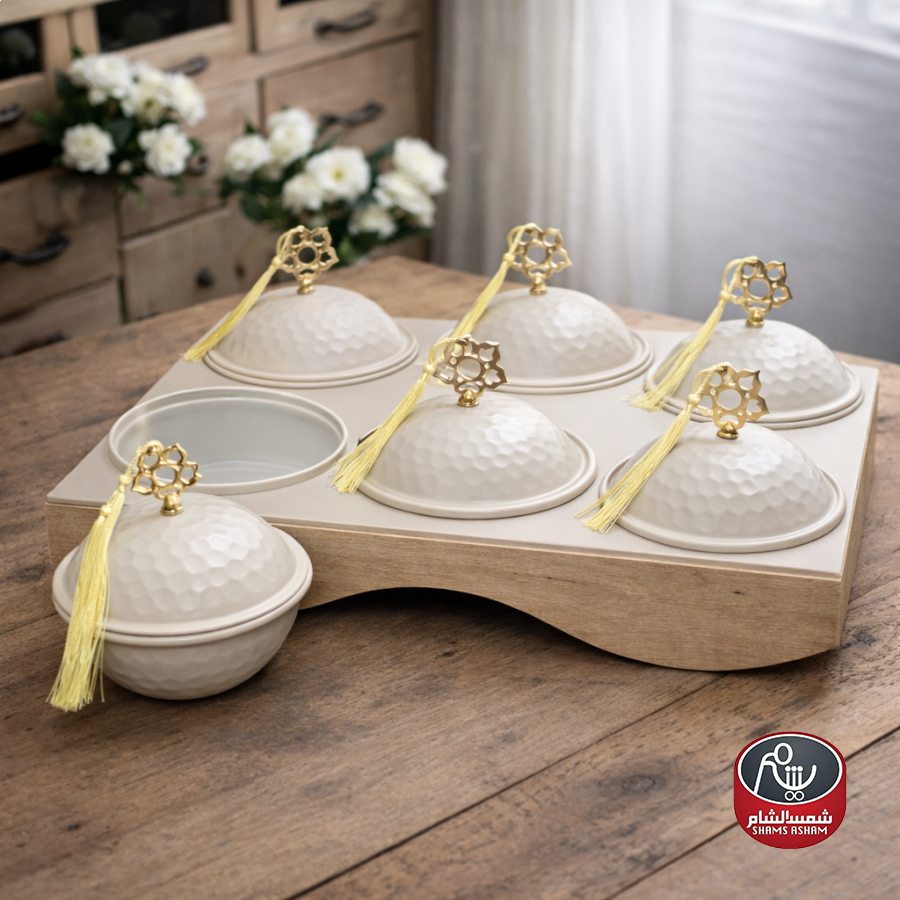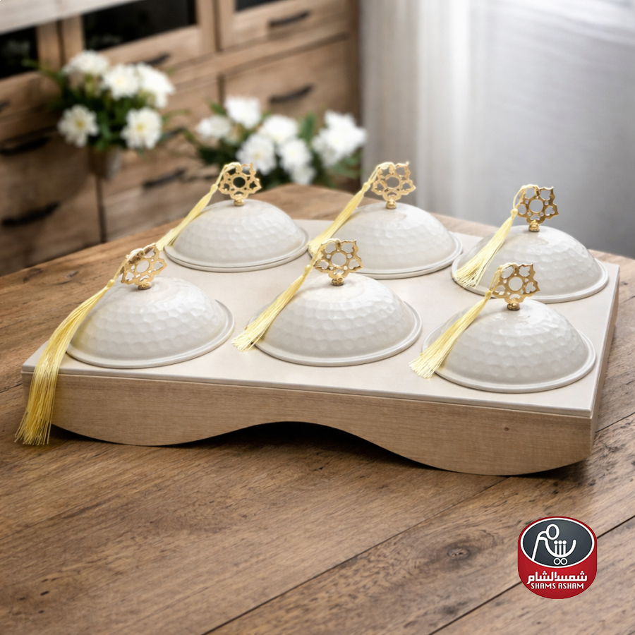 مضيفة فاخر 6 علب مع قاعدة خشبية – أبيض وذهبي ✨