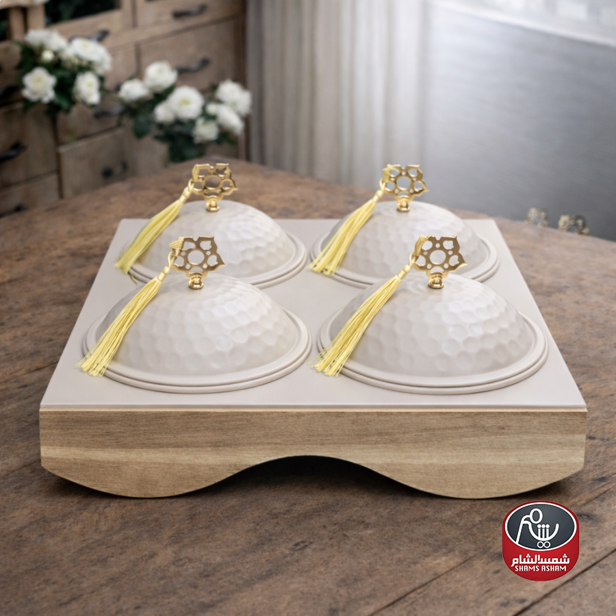طقم تقديم فاخر 4 علب مع قاعدة خشبية – أبيض وذهبي ✨