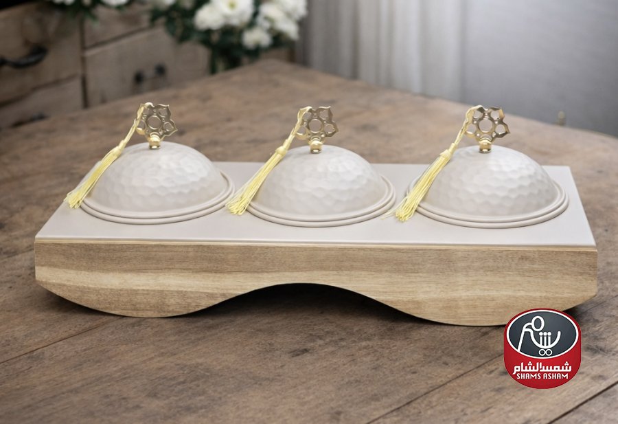 طقم تقديم فاخر 3 علب مع قاعدة خشبية – أبيض وذهبي ✨