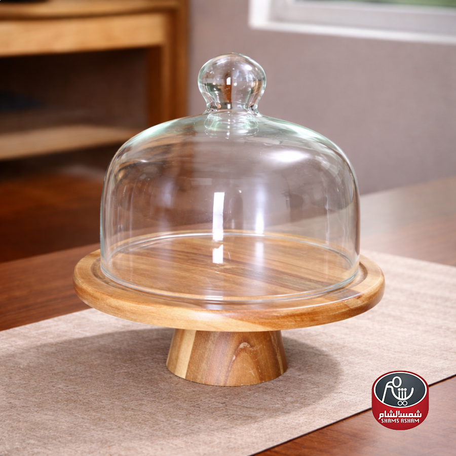 قاعدة خشبية أنيقة مع غطاء أكريليك متين وثقيل لحفظ وتقديم الكيك والحلويات بشكل راقٍ، ويحافظ على الطعام من الغبار ويظهره بشكل مرتب.
