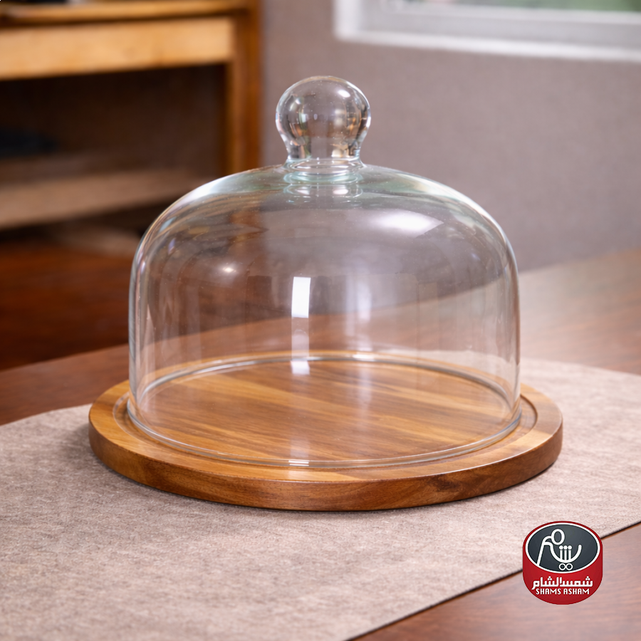قاعدة خشبية أنيقة مع غطاء أكريليك متين وثقيل لحفظ وتقديم الكيك والحلويات والفواكه بشكل راقٍ، ويحافظ على الطعام من الغبار.