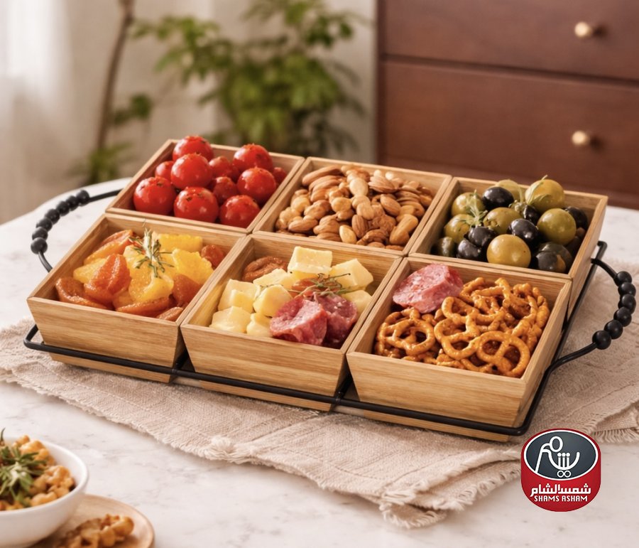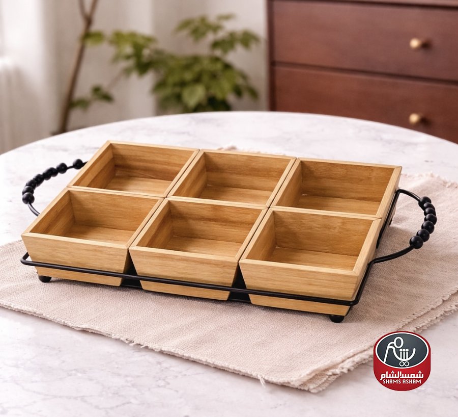 صينية تقديم خشب مع حامل معدني – 6 خانات ✨
