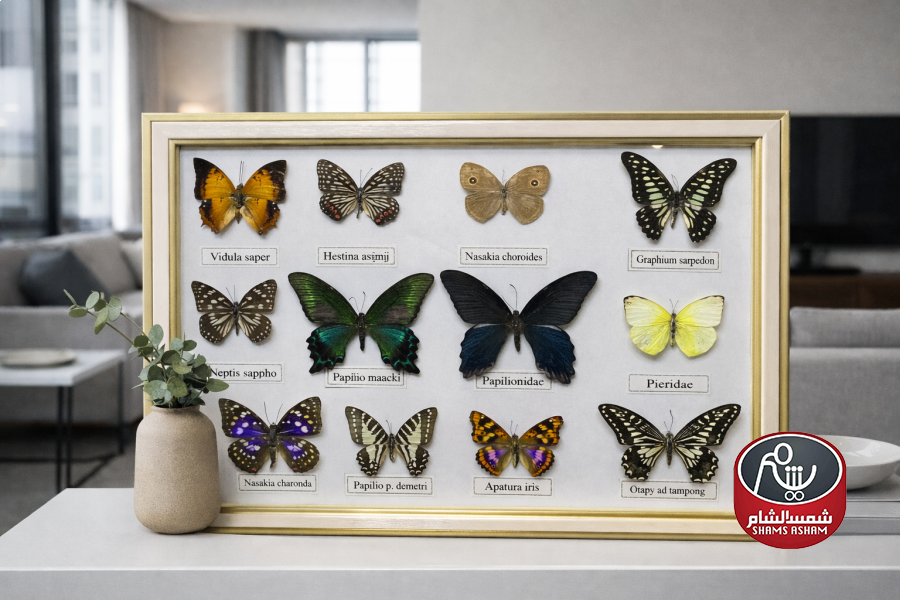 لوحة حائط فراشات طبيعية – إطار زجاجي فاخر لوحة ديكور مميزة تحتوي على مجموعة فراشات طبيعية محفوظة بألوان وتفاصيل رائعة داخل إطار أنيق، مثالية لتزيين الصالون، المدخل أو المكتب ولمسة فخامة طبيعية لأي مكان.