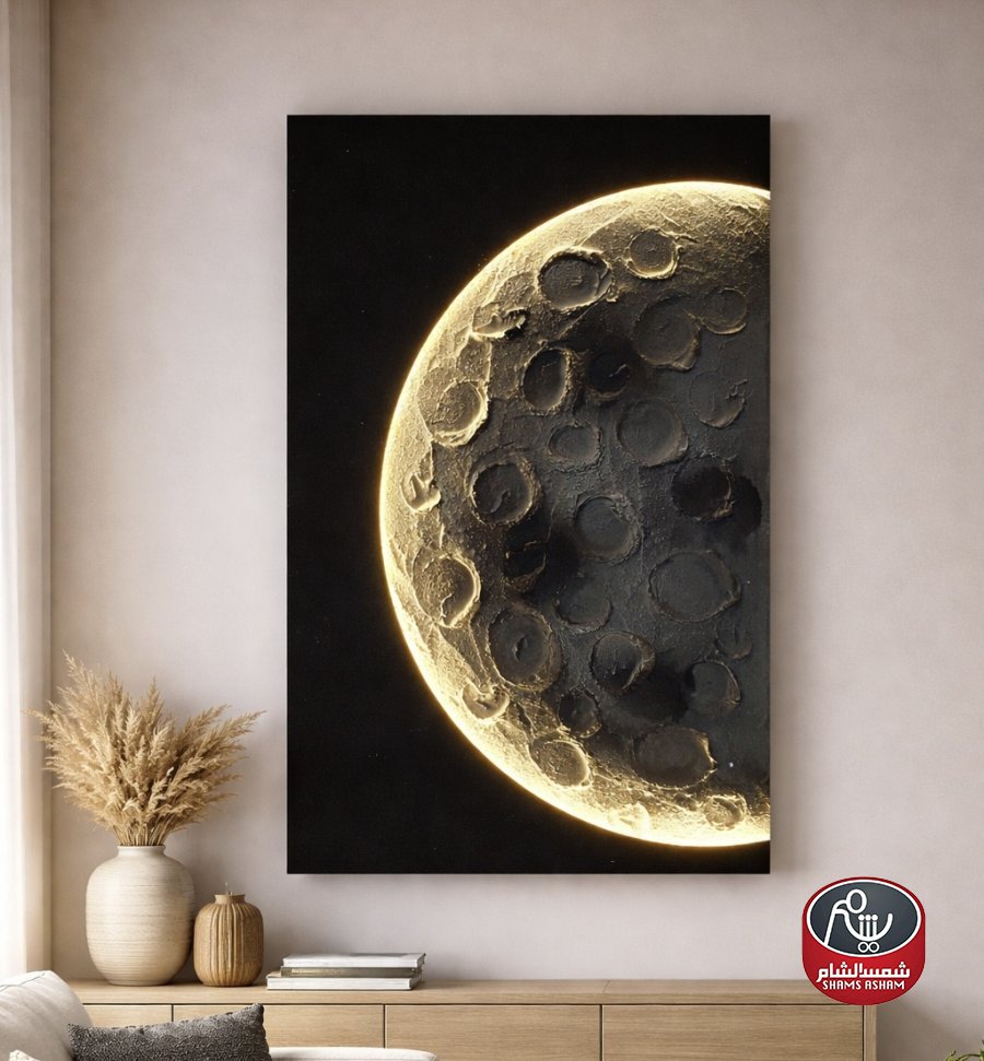برواز ديكور فاخر بتصميم قمر ثلاثي الأبعاد مع إضاءة LED دافئة تعطي لمسة راقية وأجواء هادئة للمكان. مناسب لغرفة المعيشة أو المدخل ويضيف فخامة وجمال لأي ديكور مودرن