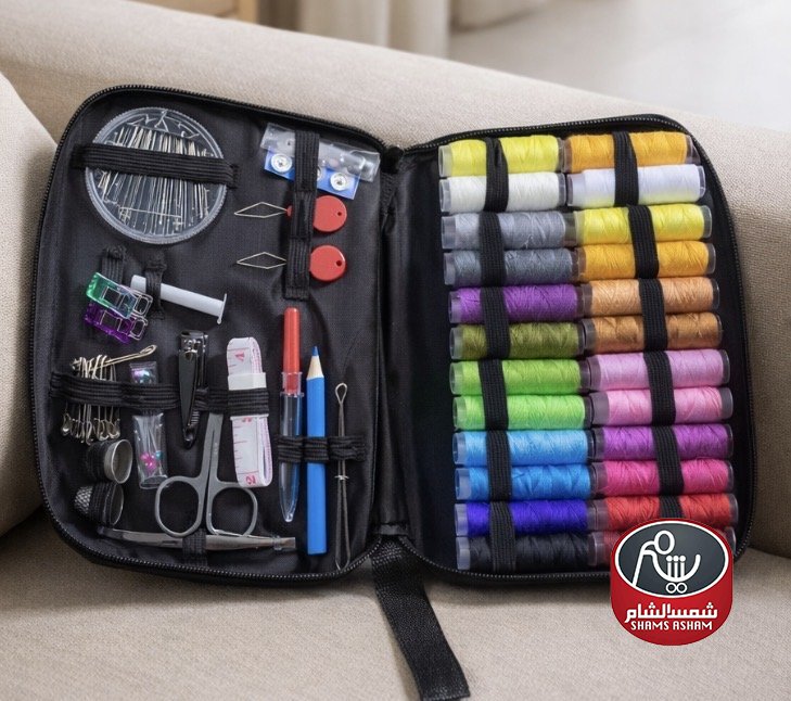 طقم خياطة متكامل داخل شنطة منظمة، يحتوي على خيوط بألوان متعددة مع إبر ومقص ومستلزمات خياطة أساسية. عملي وخفيف وسهل الحمل، مثالي للمنزل والسفر ولإصلاح الملابس بسرع